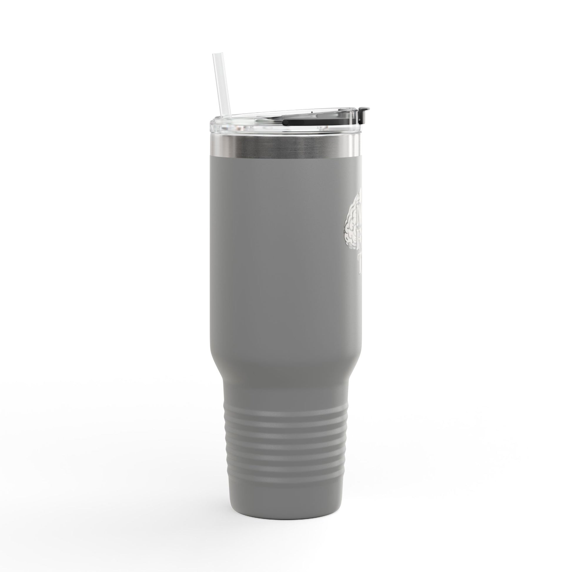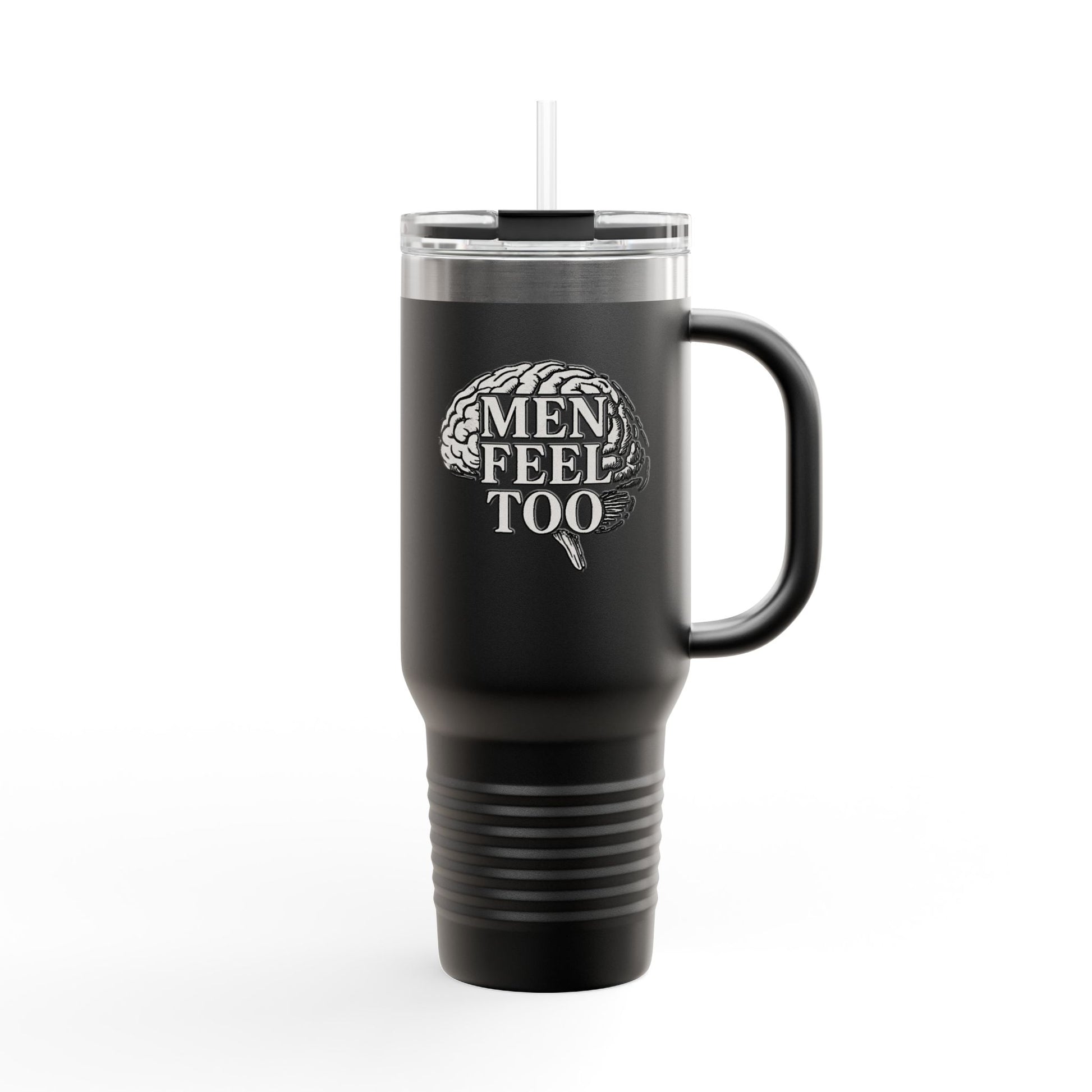 A sturdy, 40oz insulated travel mug designed to keep drinks at the right temperature through long commutes, field days, or quiet mornings at your desk. The substantial stainless-steel body and powder-coated finish stand up to daily use while the ergonomic handle and leak-proof push-on lid make it easy to carry and sip from on the go. The design — a detailed brain illustration with the phrase “Men Feel Too” — speaks directly to those who value thoughtful conversations and emotional honesty. It’s the kind of mug you reach for when you want your coffee or tea to last through deep talks, early starts, or afternoons of focused work. Offered with a reusable straw and in multiple color options, it balances function with a subtle, meaningful statement that fits into everyday life and intentional moments.
