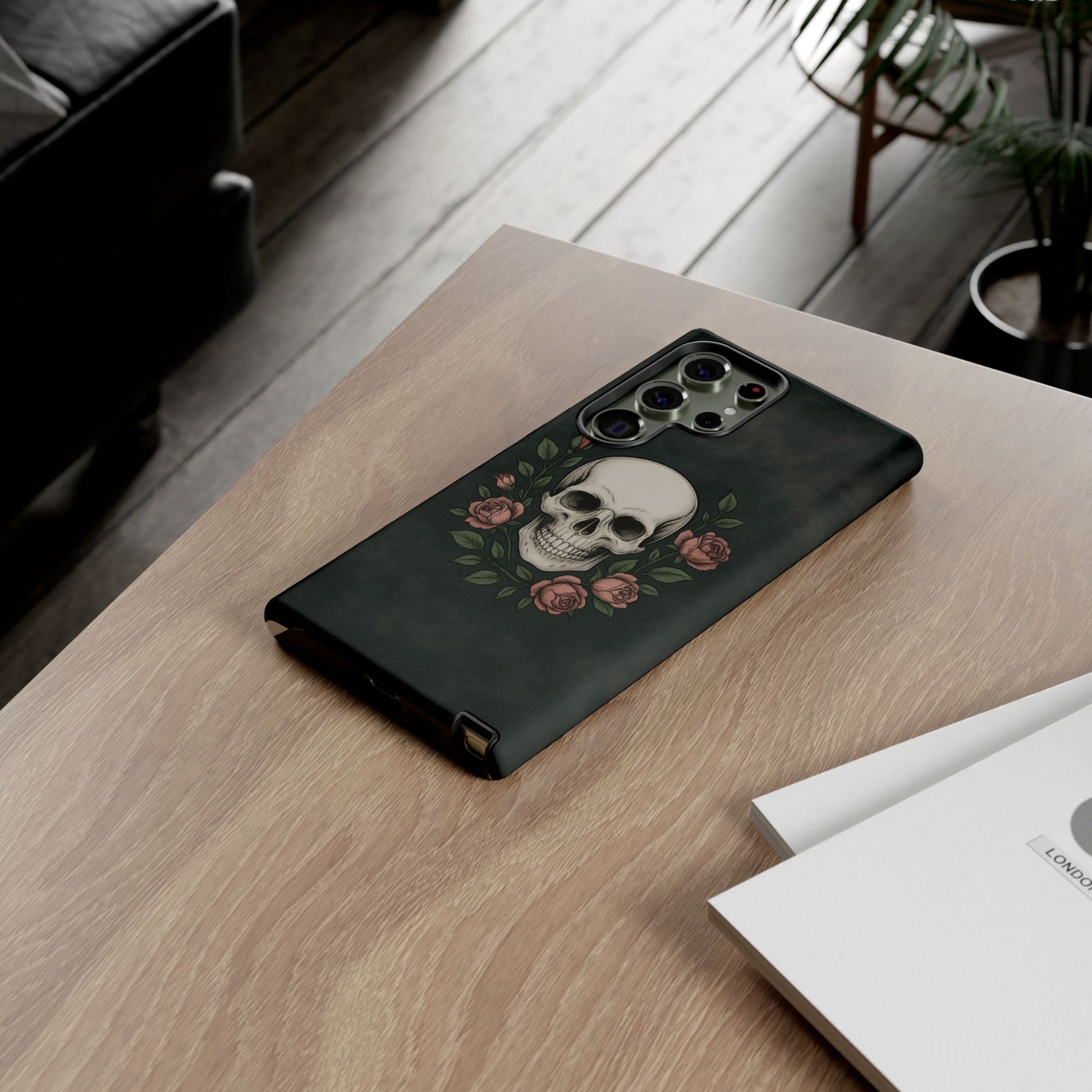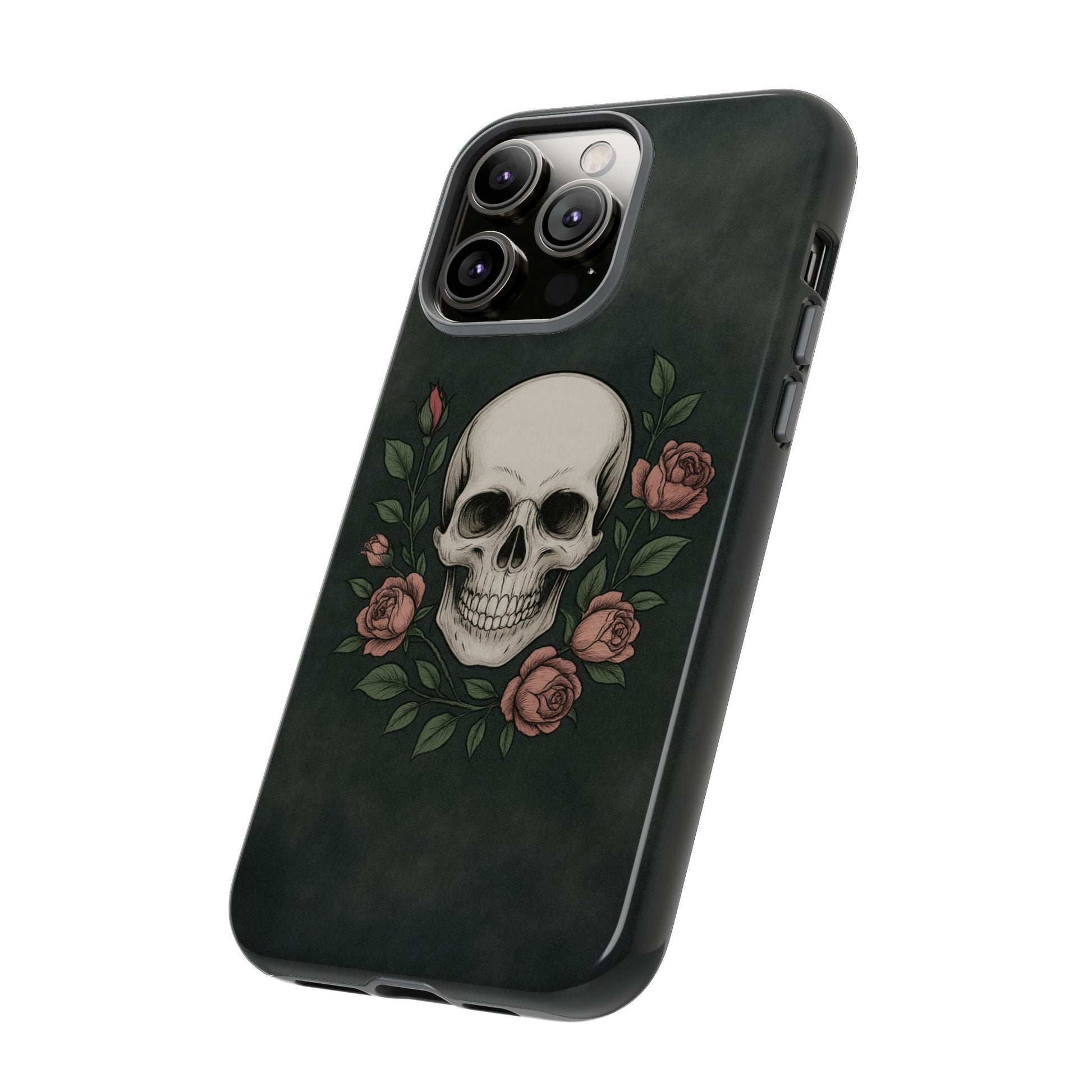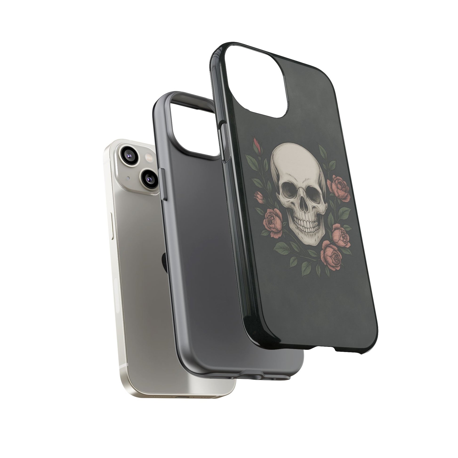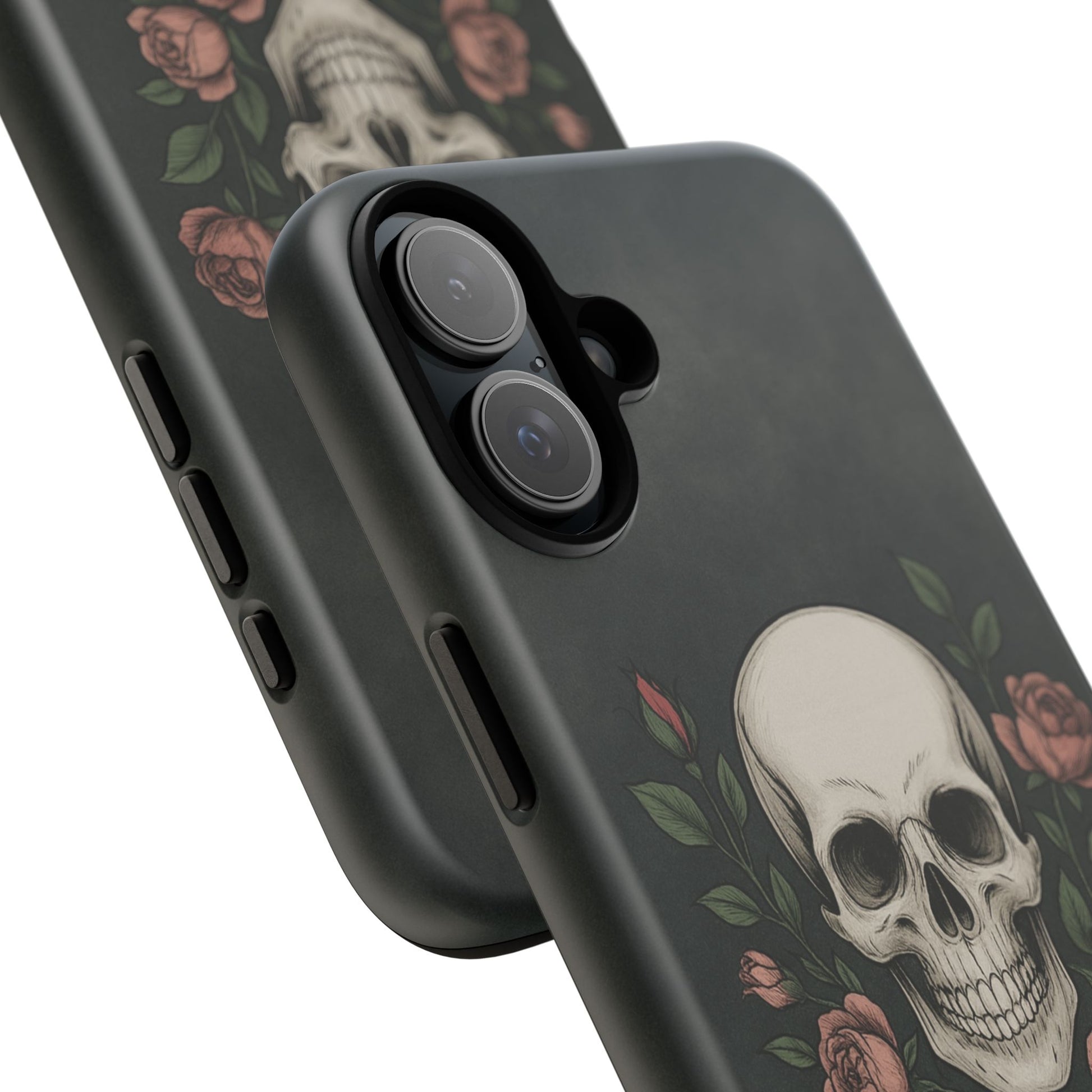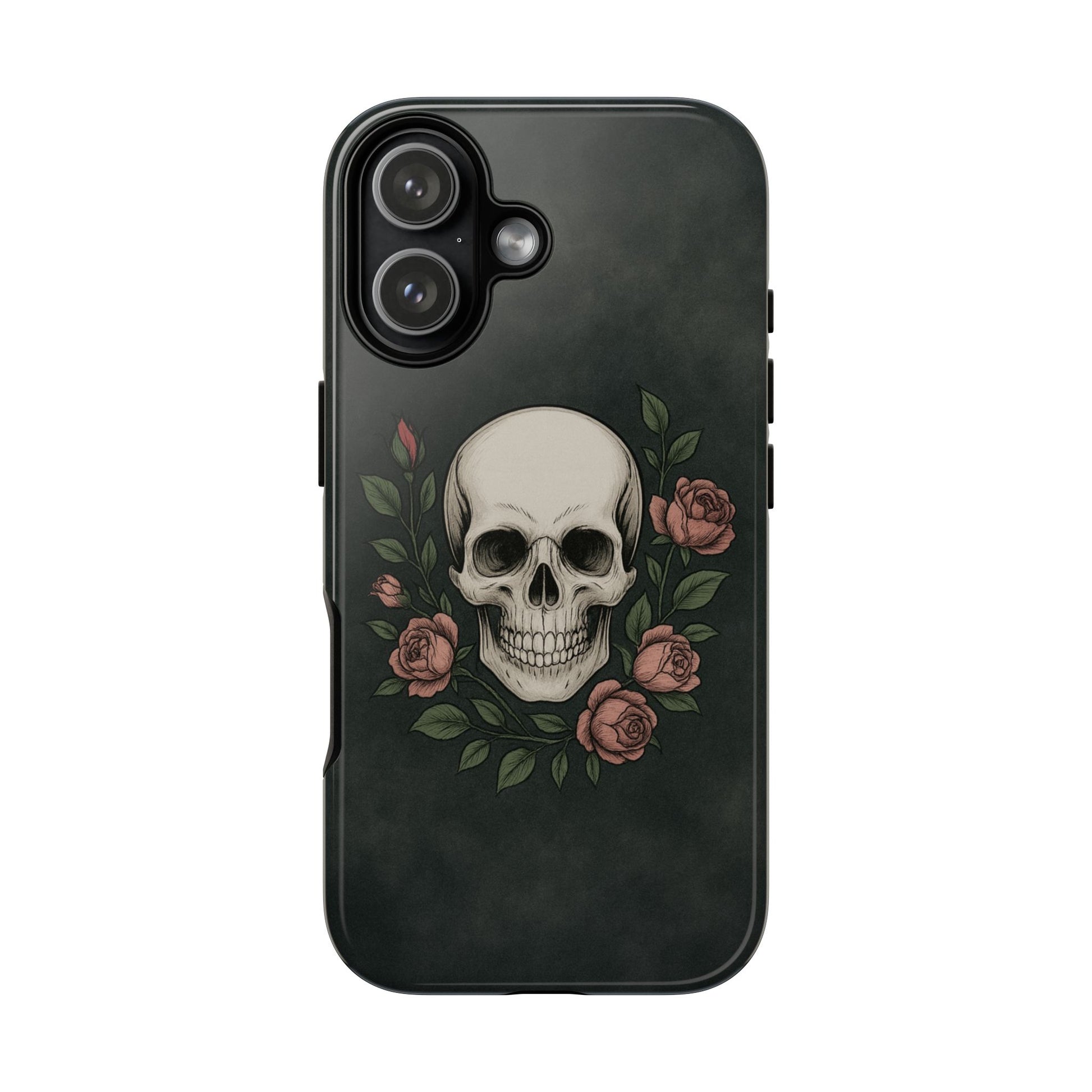 This slim, dual-layer phone case pairs gothic charm with everyday protection. A hand-drawn skull sits framed by delicate roses against a deep, textured background — moody and artful, not loud. The glossy or matte finish keeps the artwork vivid while the TPU silicone liner cushions sharp impacts. It tucks into daily life effortlessly: slips into pockets, withstands commuting scrapes, and supports wireless charging when you need a quick top-up. For those who lean toward dark, vintage-inspired style, it reads like a small talisman for your phone — subtle, personal, and built to last.