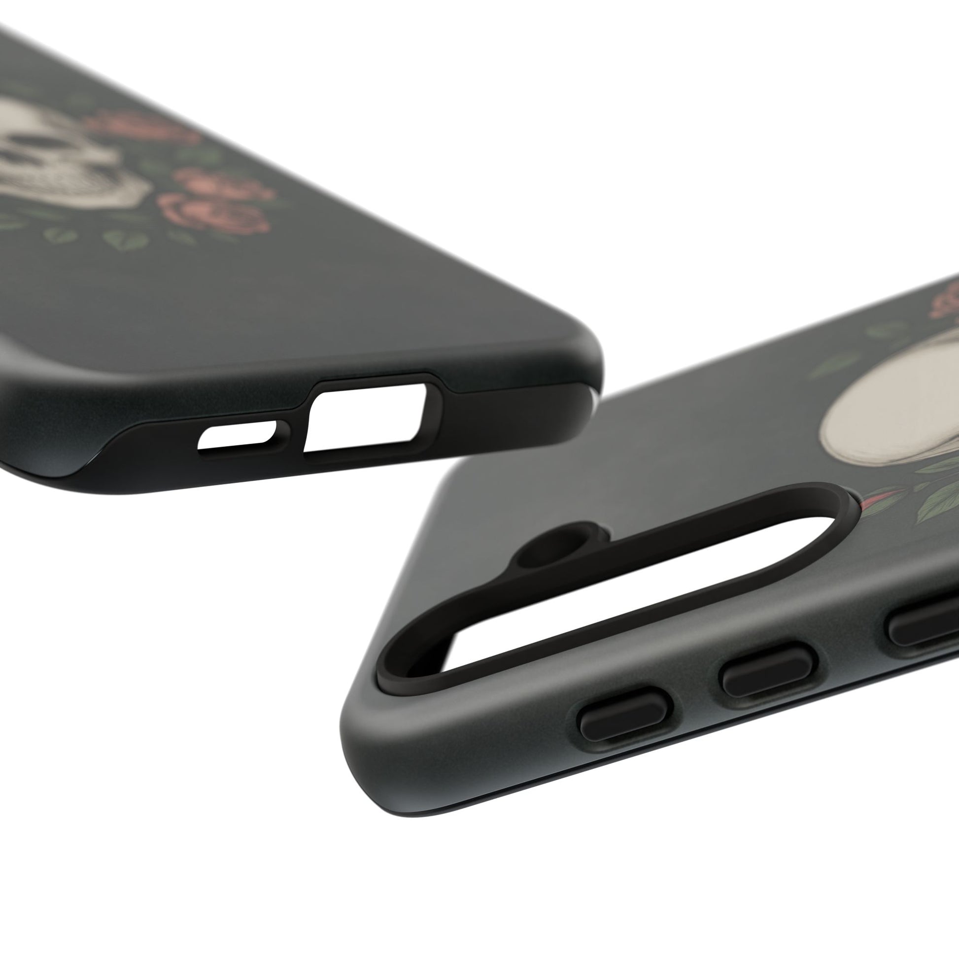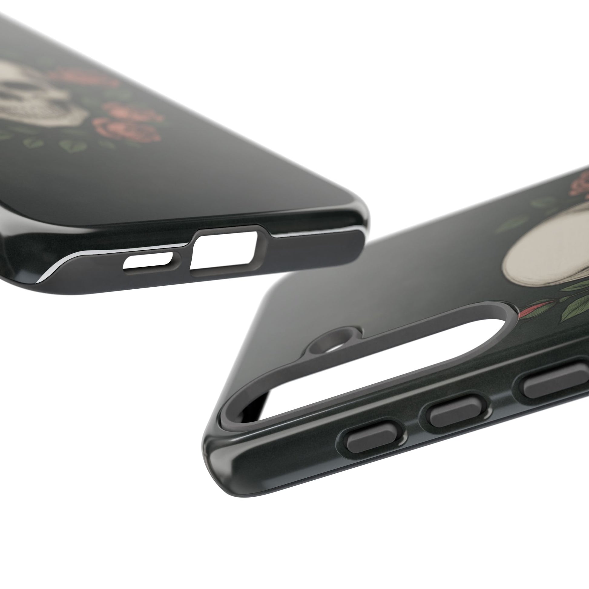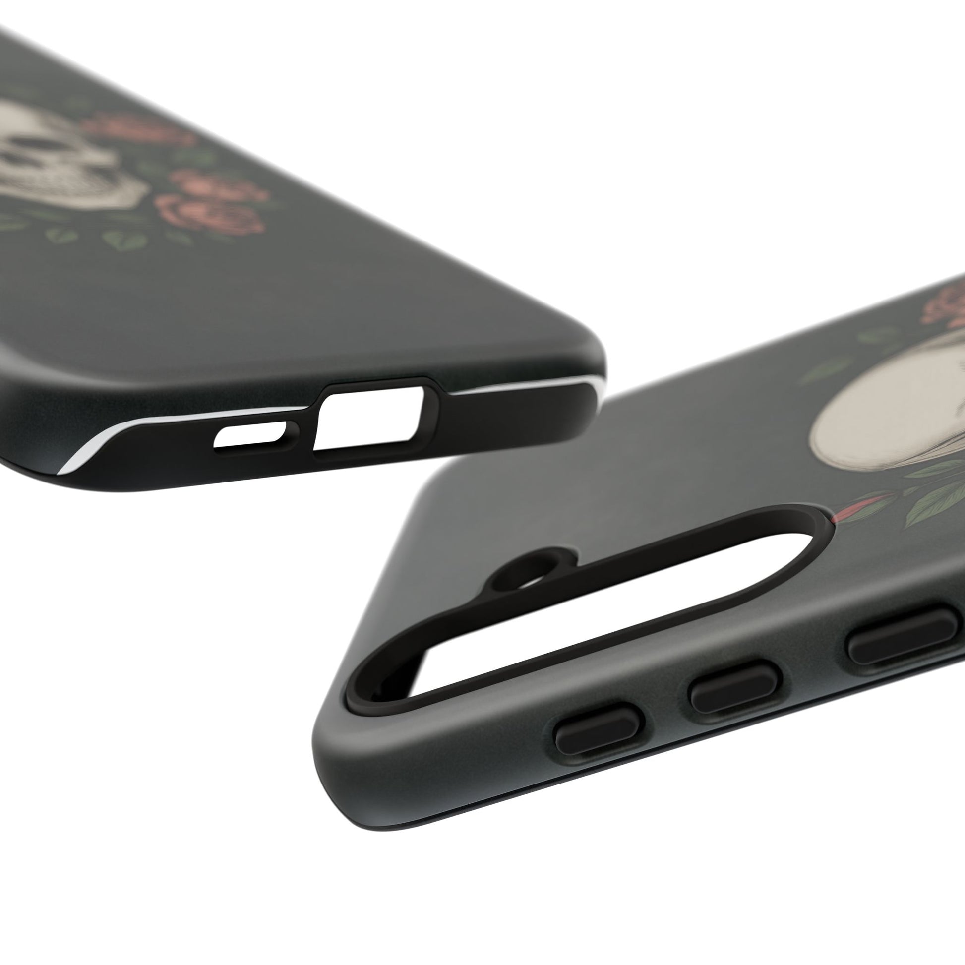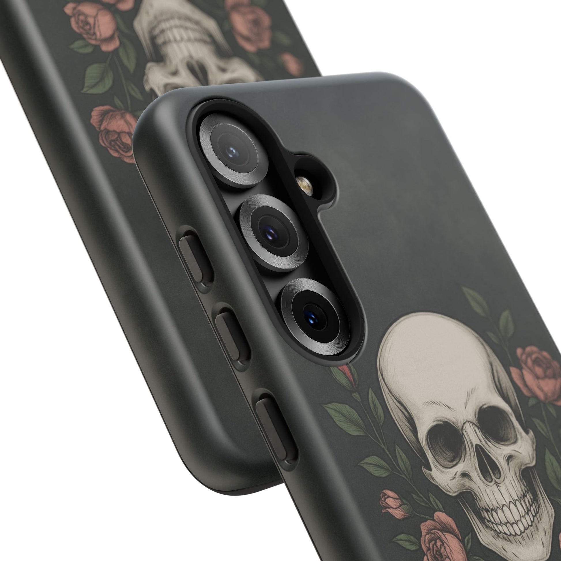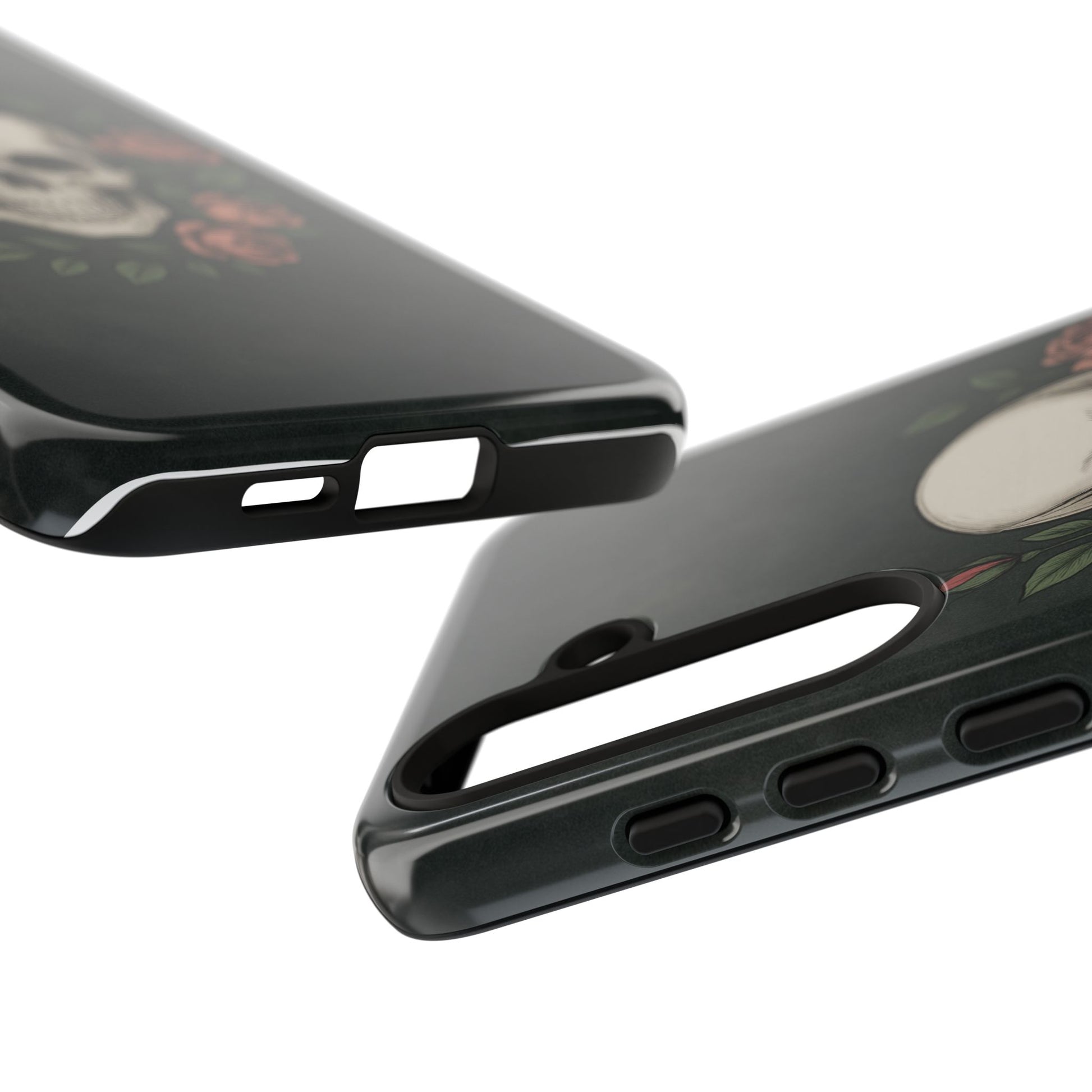 This slim, dual-layer phone case pairs gothic charm with everyday protection. A hand-drawn skull sits framed by delicate roses against a deep, textured background — moody and artful, not loud. The glossy or matte finish keeps the artwork vivid while the TPU silicone liner cushions sharp impacts. It tucks into daily life effortlessly: slips into pockets, withstands commuting scrapes, and supports wireless charging when you need a quick top-up. For those who lean toward dark, vintage-inspired style, it reads like a small talisman for your phone — subtle, personal, and built to last.