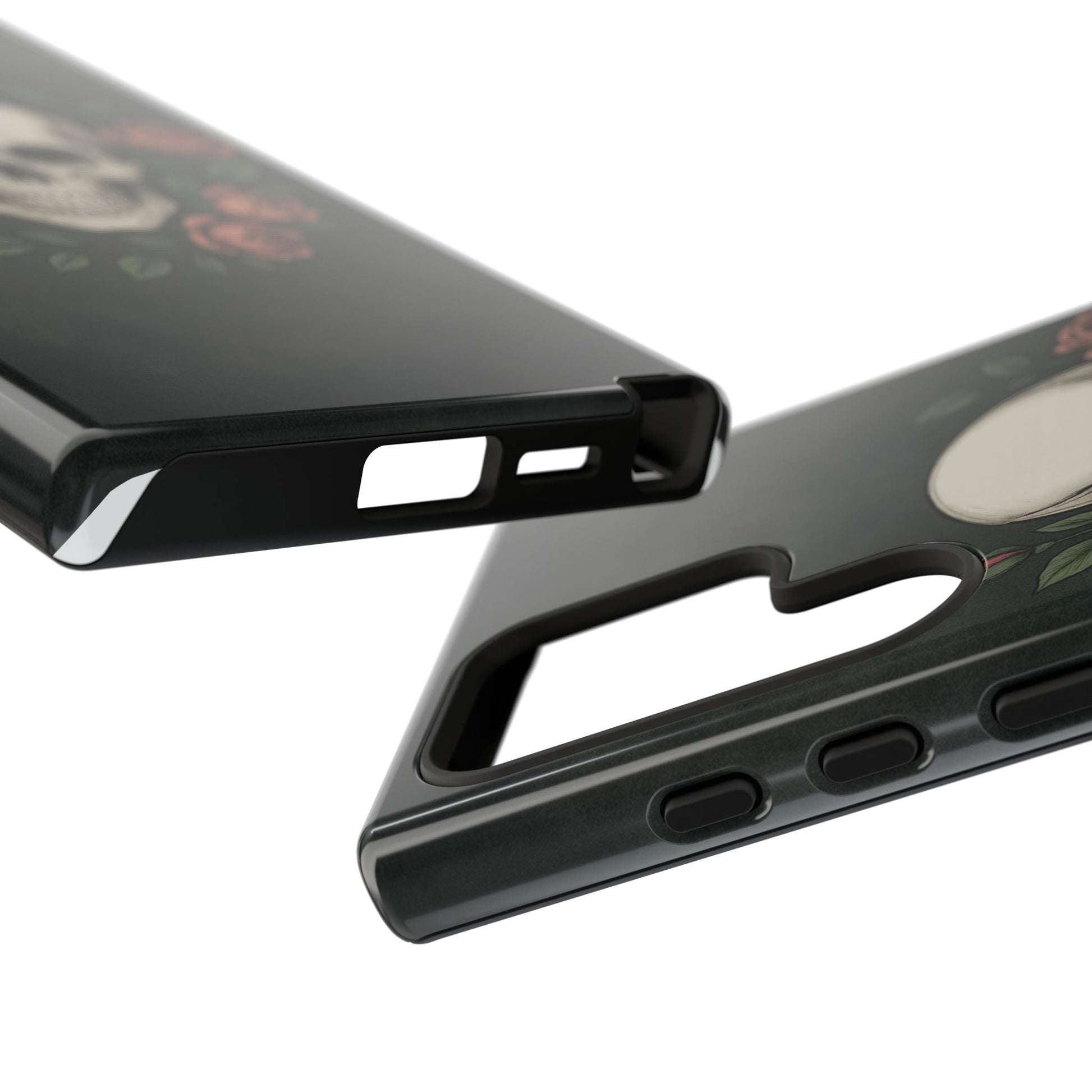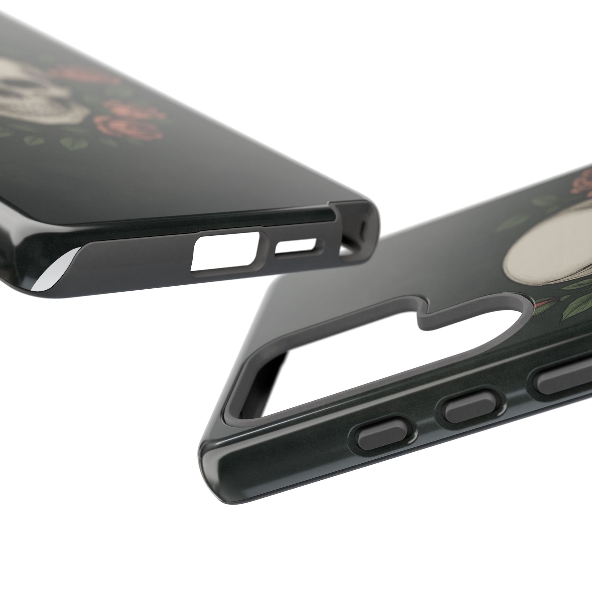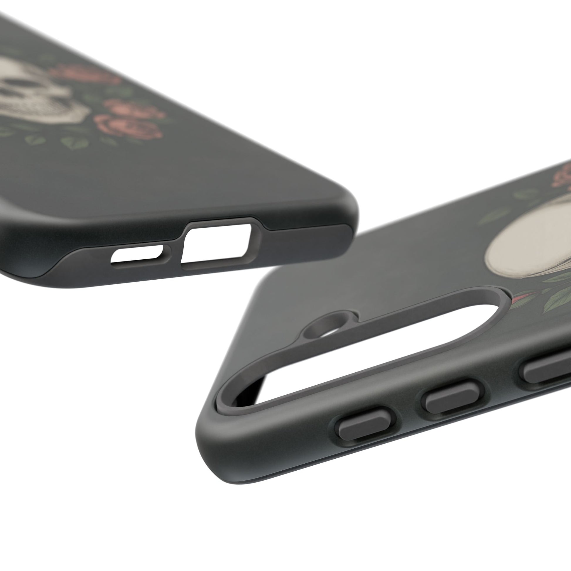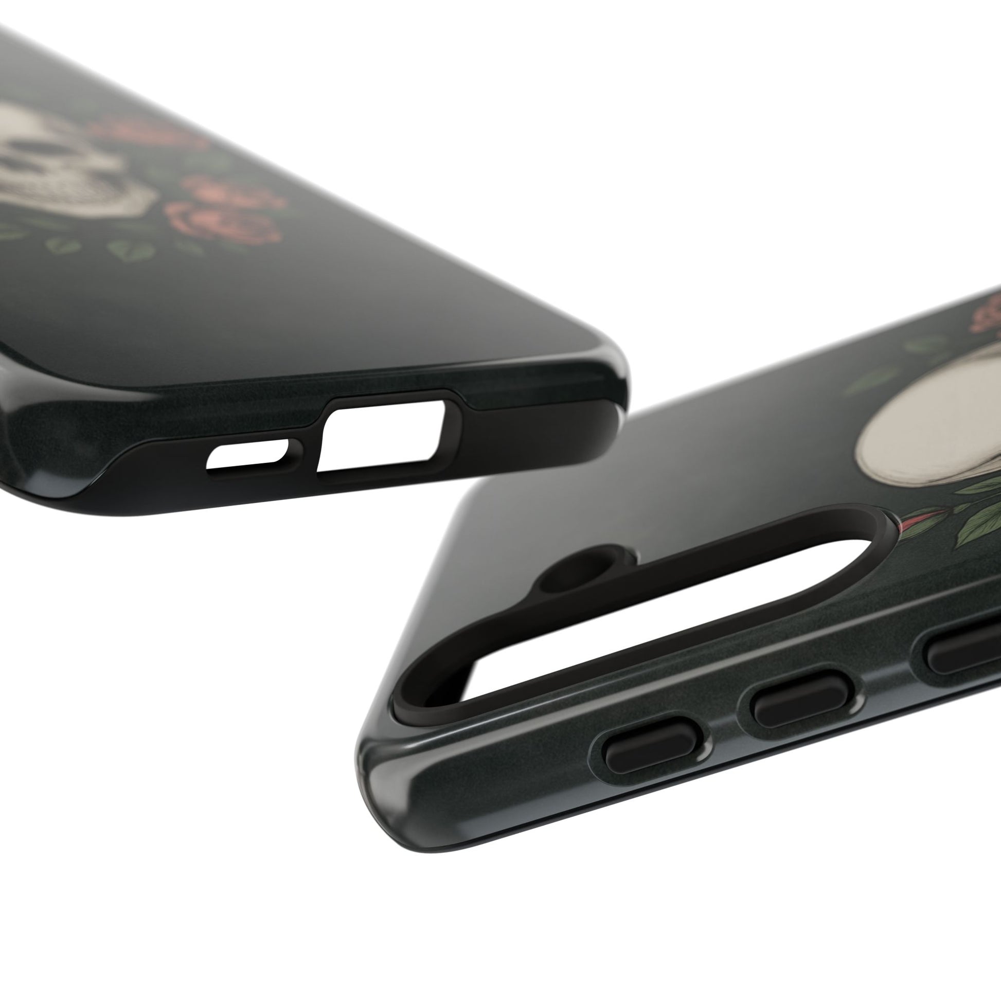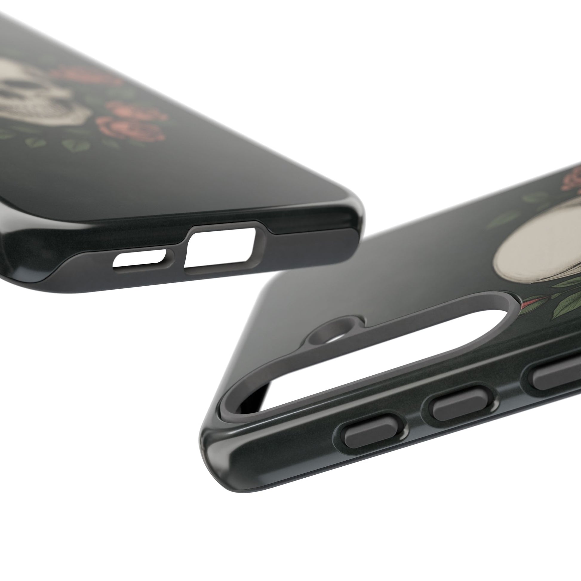 This slim, dual-layer phone case pairs gothic charm with everyday protection. A hand-drawn skull sits framed by delicate roses against a deep, textured background — moody and artful, not loud. The glossy or matte finish keeps the artwork vivid while the TPU silicone liner cushions sharp impacts. It tucks into daily life effortlessly: slips into pockets, withstands commuting scrapes, and supports wireless charging when you need a quick top-up. For those who lean toward dark, vintage-inspired style, it reads like a small talisman for your phone — subtle, personal, and built to last.