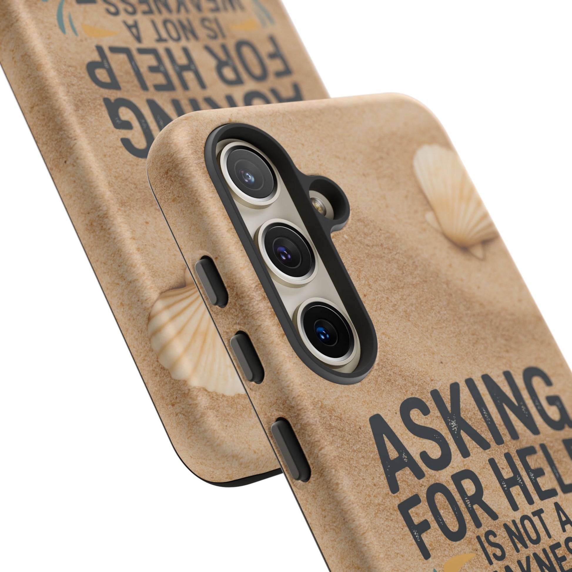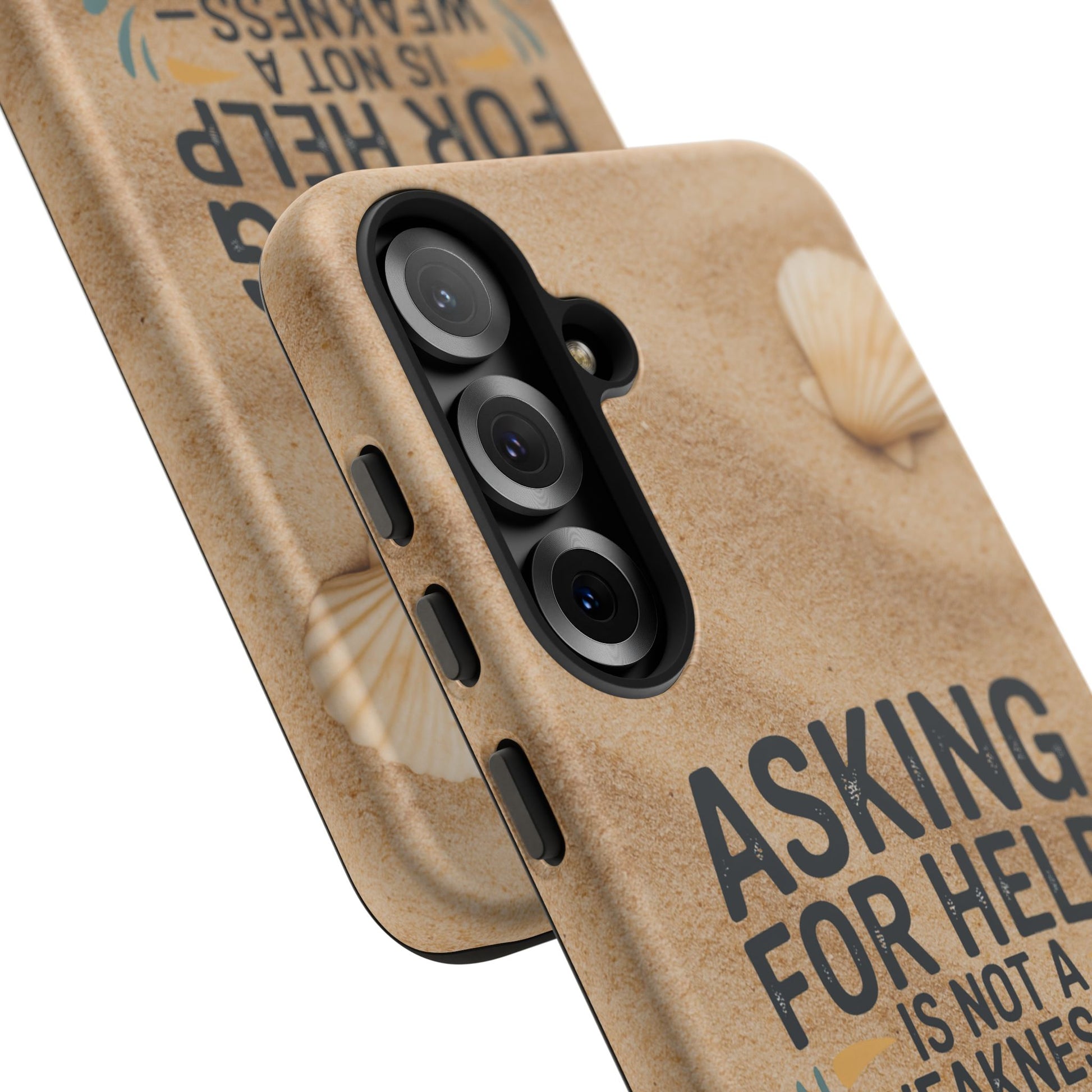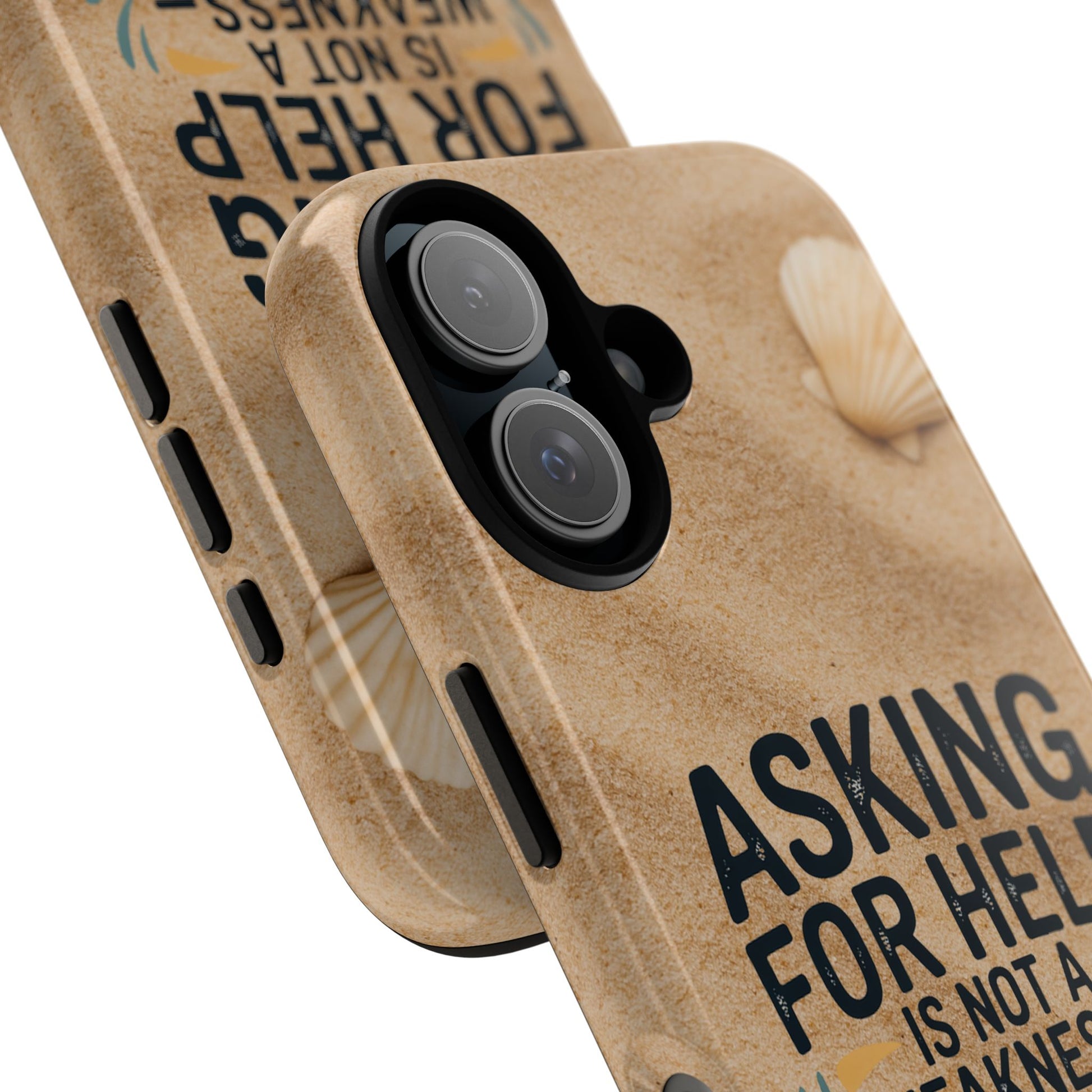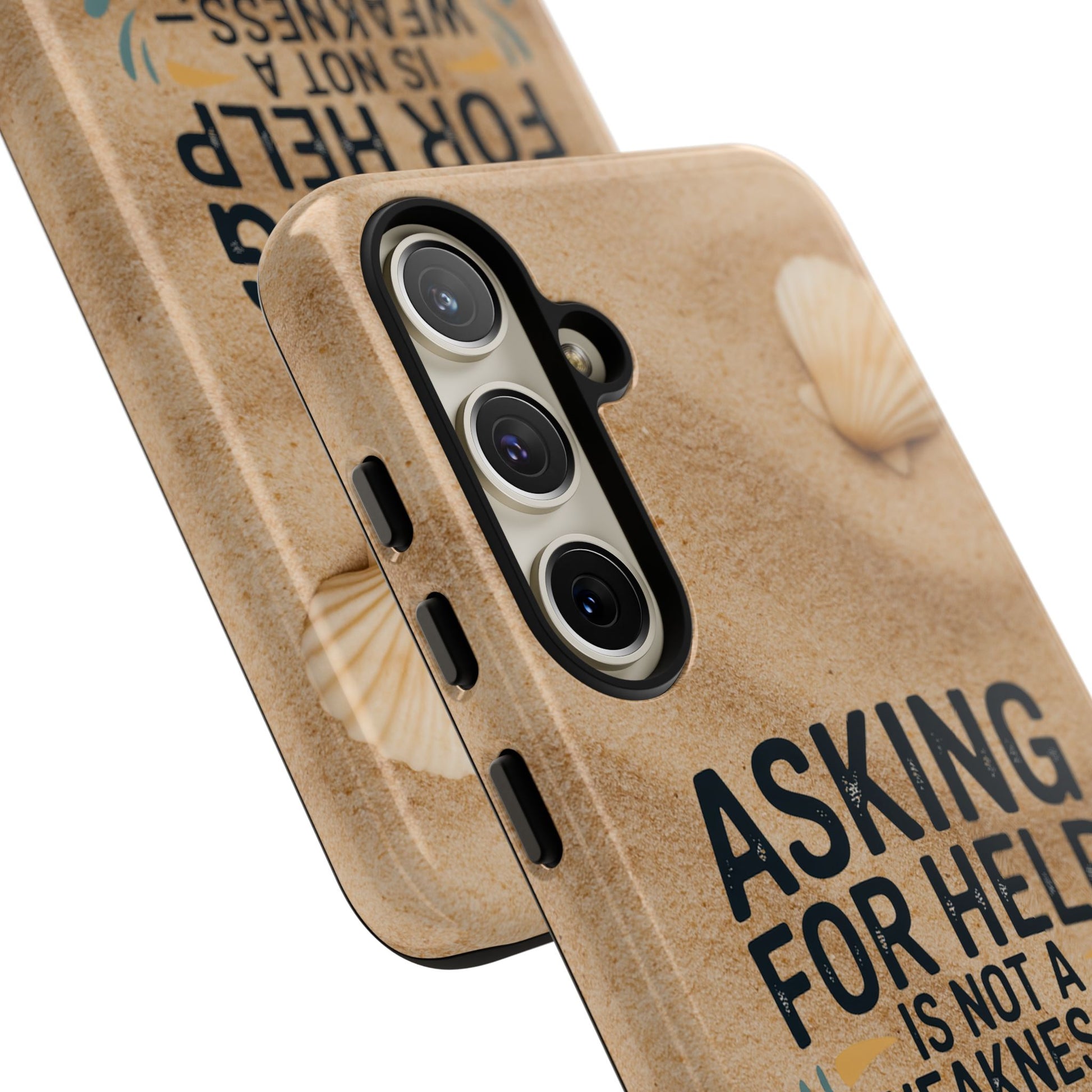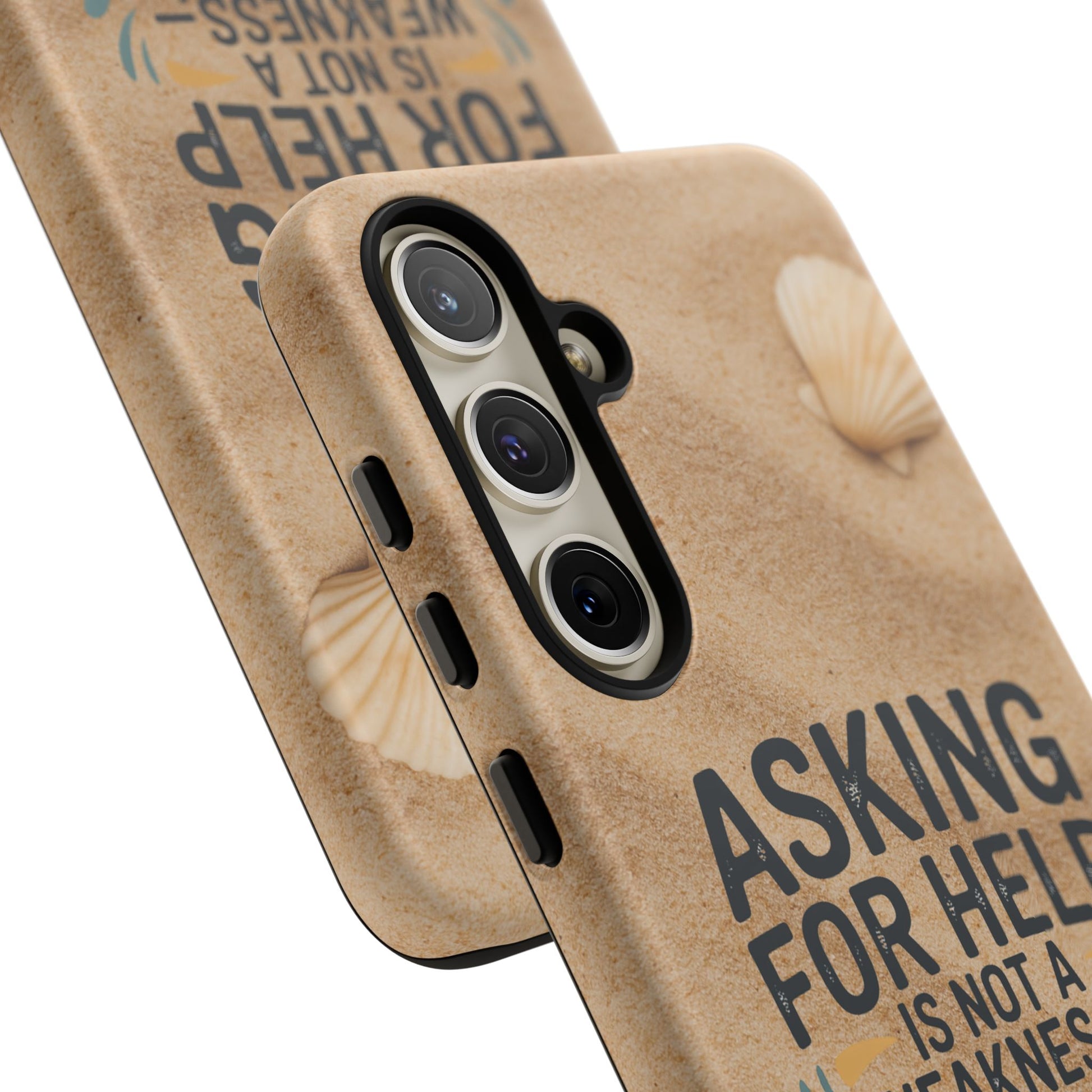 A slim, dual-layer phone case that carries a gentle reminder: asking for help is strength, not weakness. The soft sandy backdrop and small seashell accents give it a calm, coastal feel while the bold, handwritten typography reads like a supportive note. Built with a glossy or matte finish over a 3D-wrapped print, the case keeps your phone safe from drops and daily wear with a shock-absorbing TPU silicone liner and a rigid polycarbonate shell. Weather-resistant inks and certified materials mean the design holds up outdoors and everyday use. Lightweight and wireless-charging compatible, it’s designed to slip comfortably into life — on crowded commutes, quiet beach walks, or between work calls — offering both protection and a quiet, encouraging message.