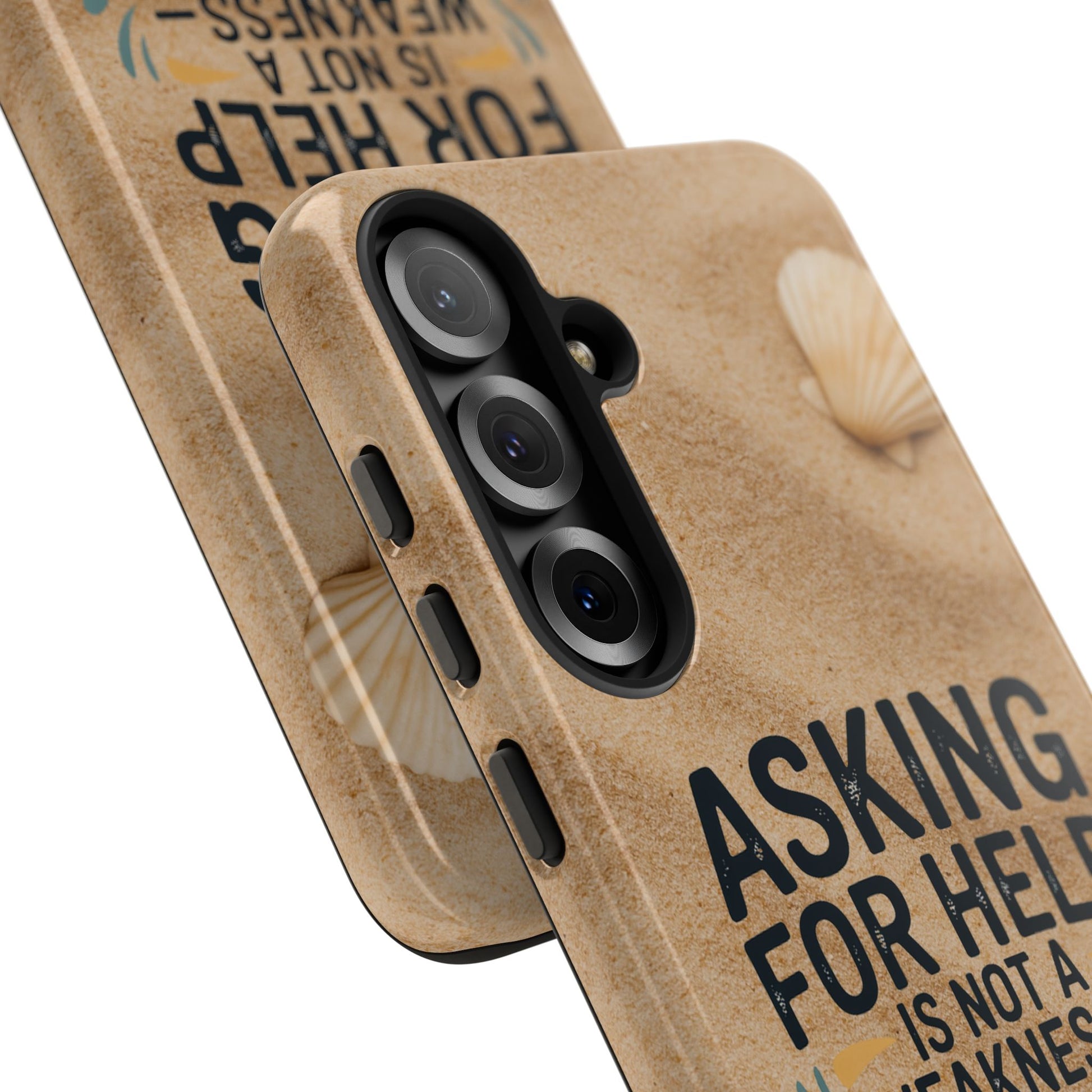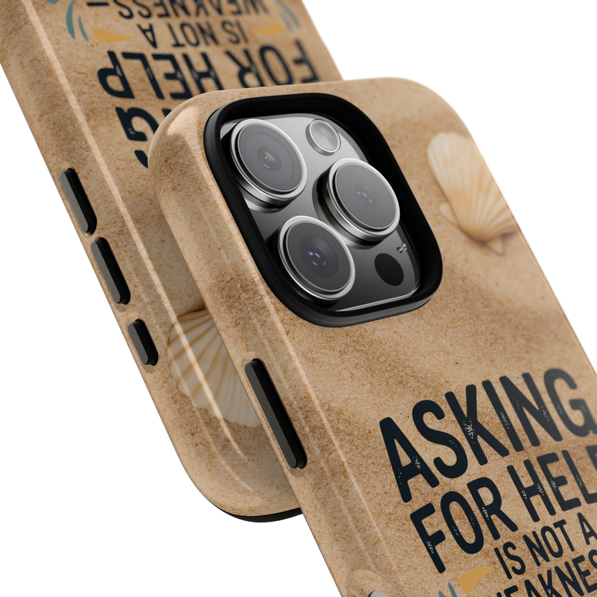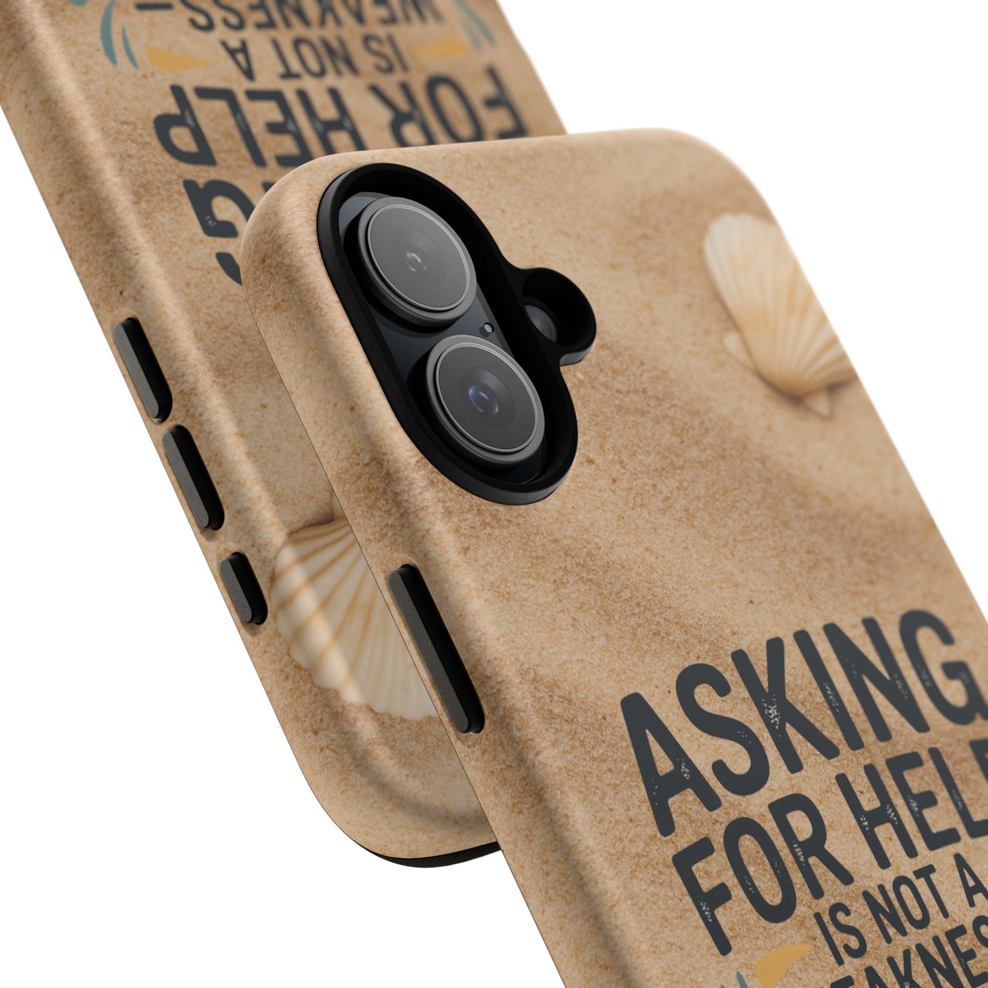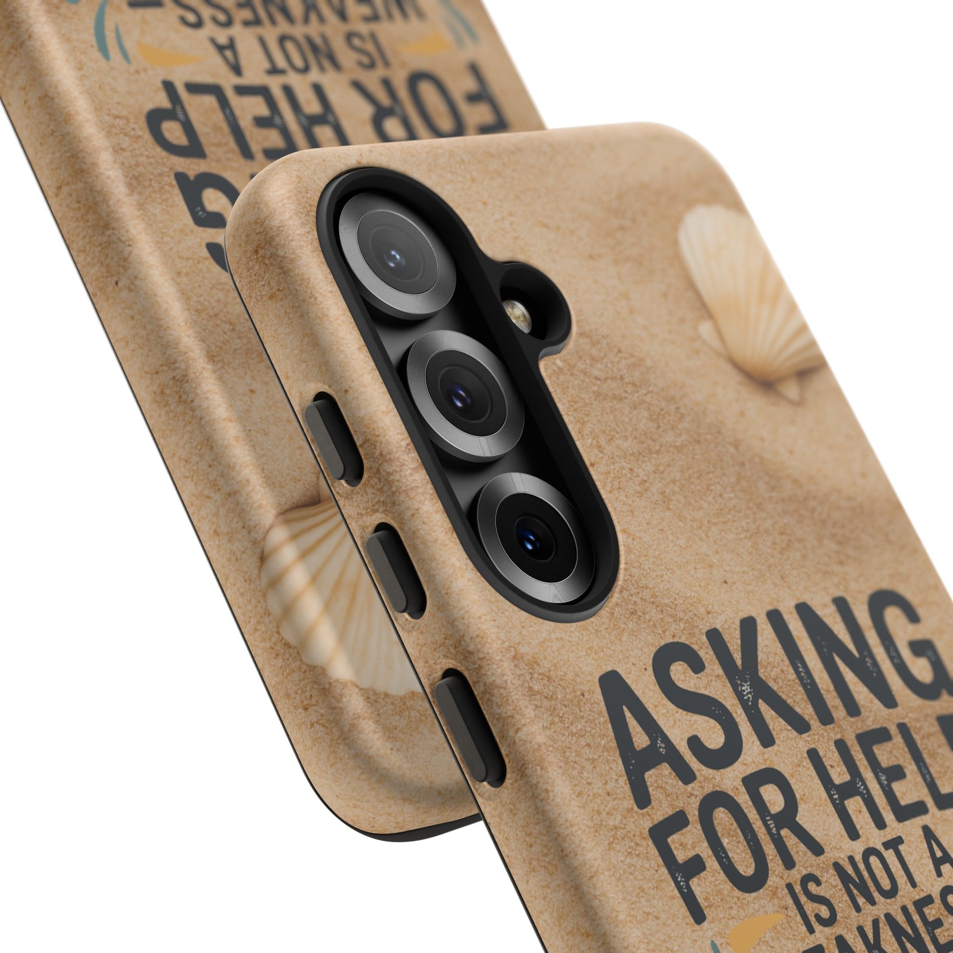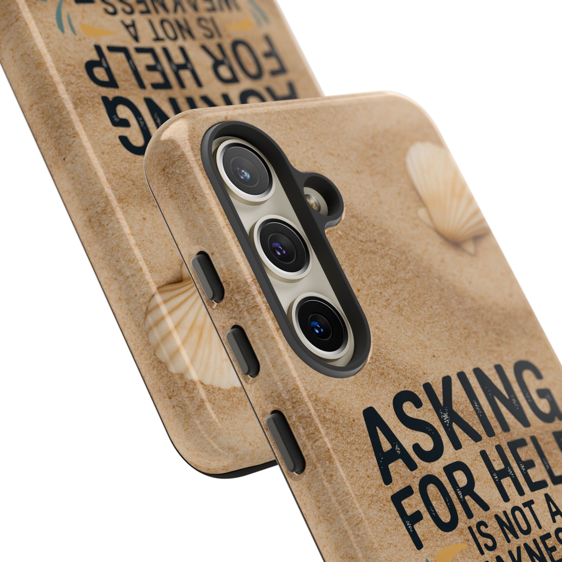 A slim, dual-layer phone case that carries a gentle reminder: asking for help is strength, not weakness. The soft sandy backdrop and small seashell accents give it a calm, coastal feel while the bold, handwritten typography reads like a supportive note. Built with a glossy or matte finish over a 3D-wrapped print, the case keeps your phone safe from drops and daily wear with a shock-absorbing TPU silicone liner and a rigid polycarbonate shell. Weather-resistant inks and certified materials mean the design holds up outdoors and everyday use. Lightweight and wireless-charging compatible, it’s designed to slip comfortably into life — on crowded commutes, quiet beach walks, or between work calls — offering both protection and a quiet, encouraging message.