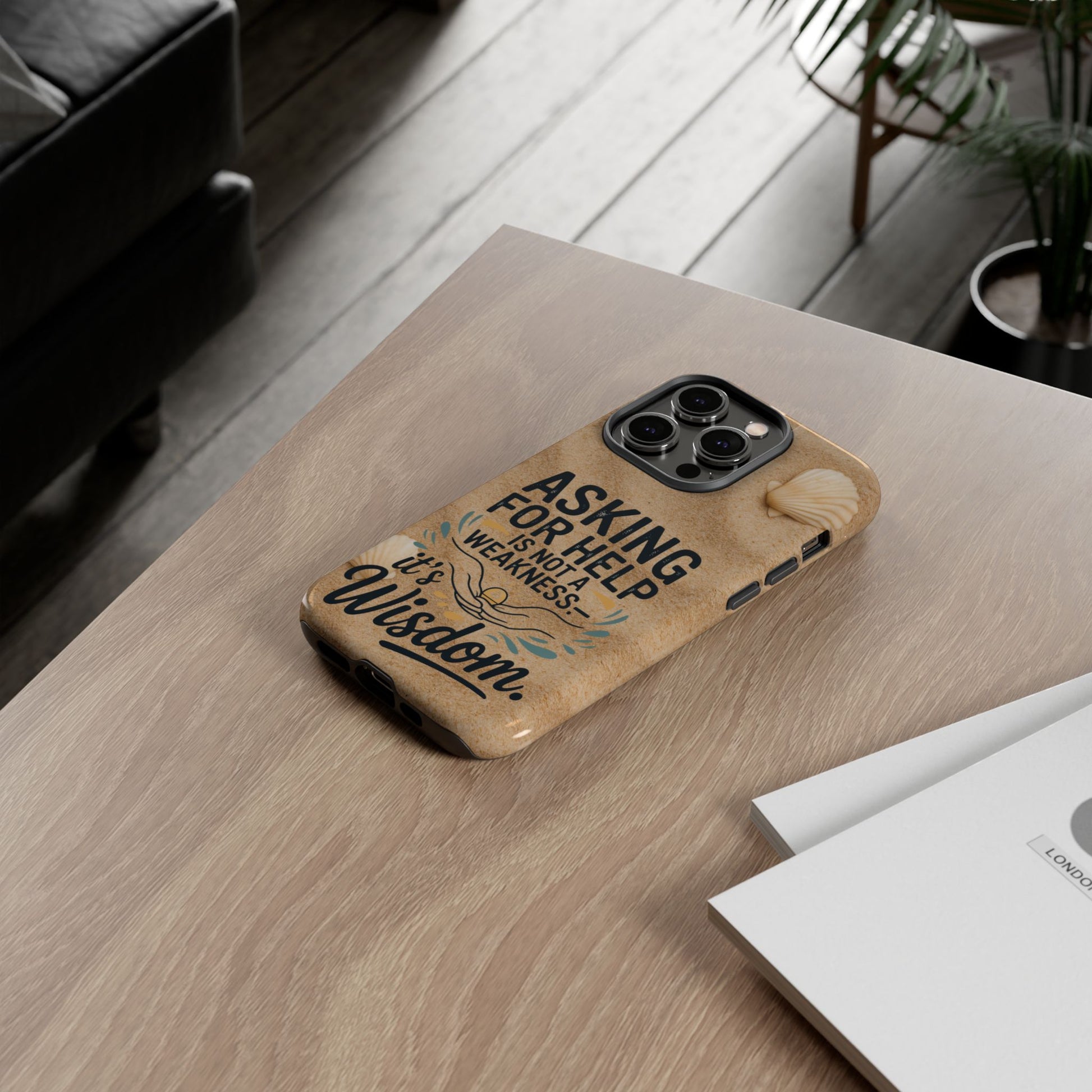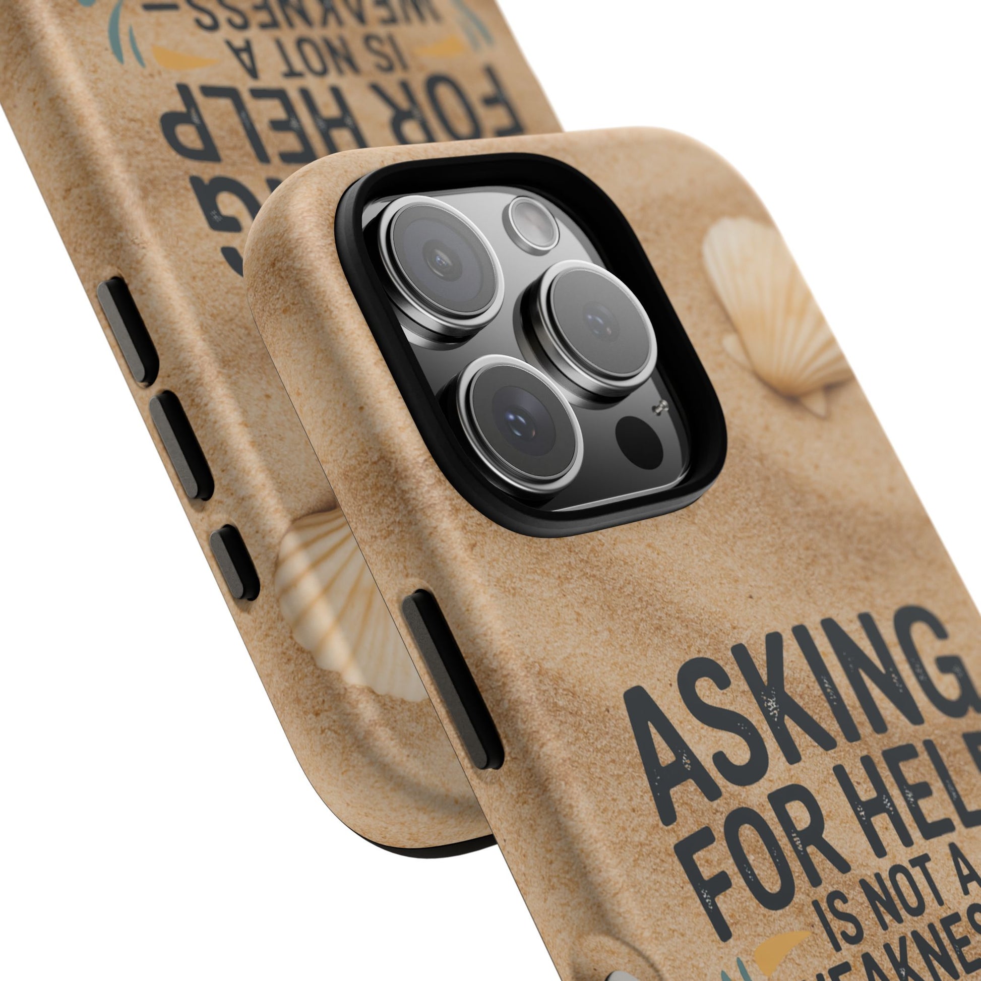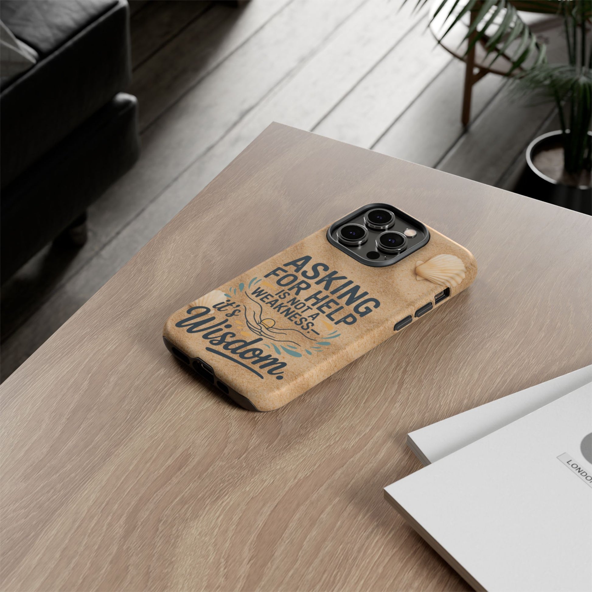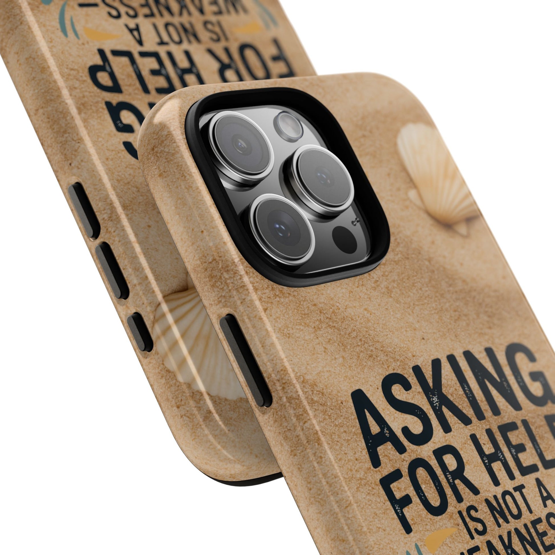 A slim, dual-layer phone case that carries a gentle reminder: asking for help is strength, not weakness. The soft sandy backdrop and small seashell accents give it a calm, coastal feel while the bold, handwritten typography reads like a supportive note. Built with a glossy or matte finish over a 3D-wrapped print, the case keeps your phone safe from drops and daily wear with a shock-absorbing TPU silicone liner and a rigid polycarbonate shell. Weather-resistant inks and certified materials mean the design holds up outdoors and everyday use. Lightweight and wireless-charging compatible, it’s designed to slip comfortably into life — on crowded commutes, quiet beach walks, or between work calls — offering both protection and a quiet, encouraging message.