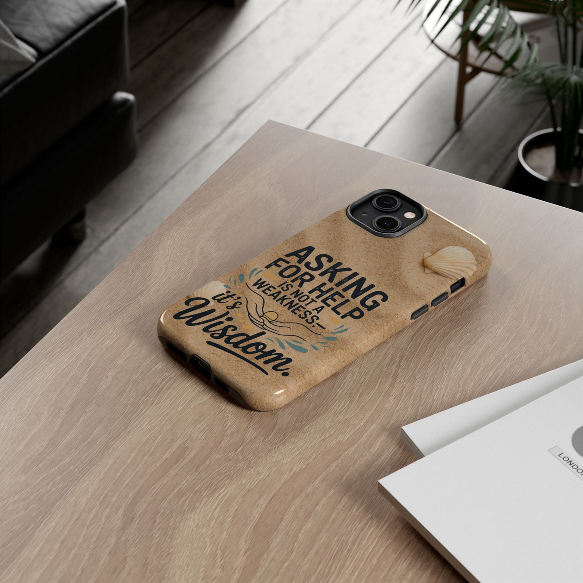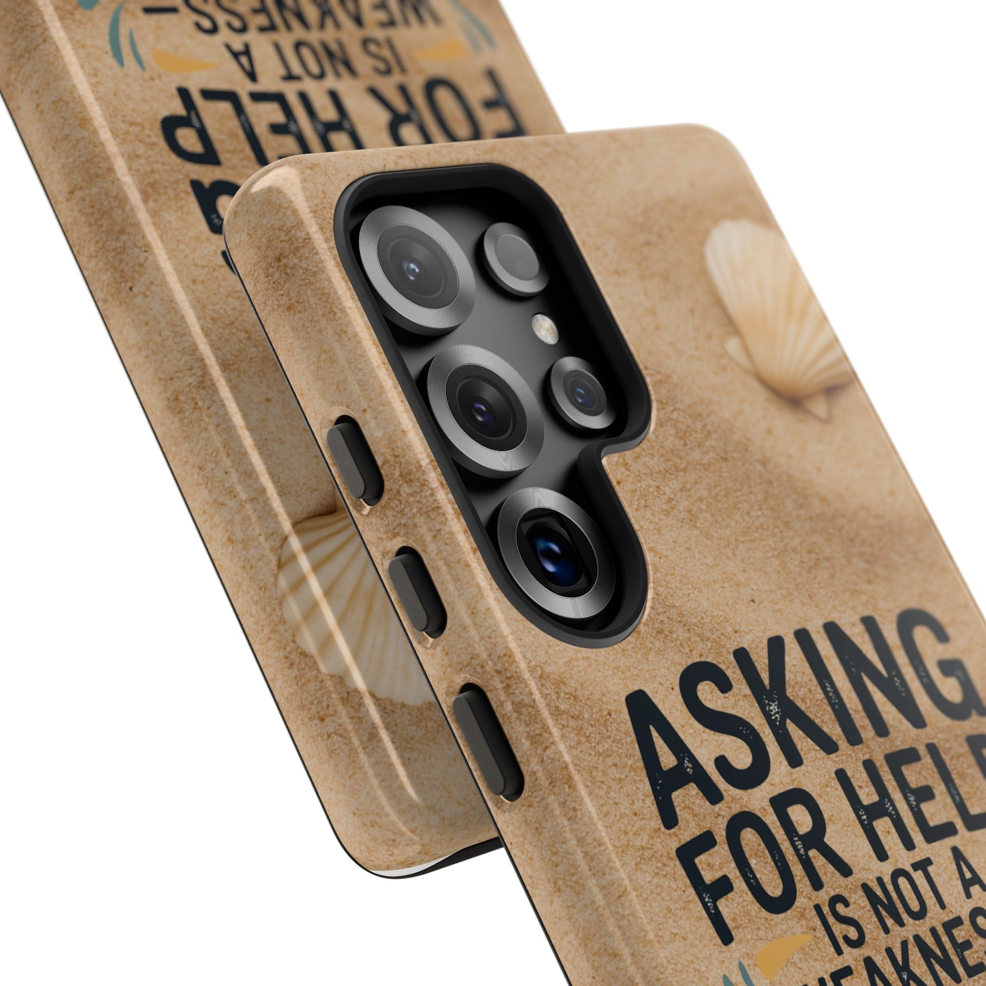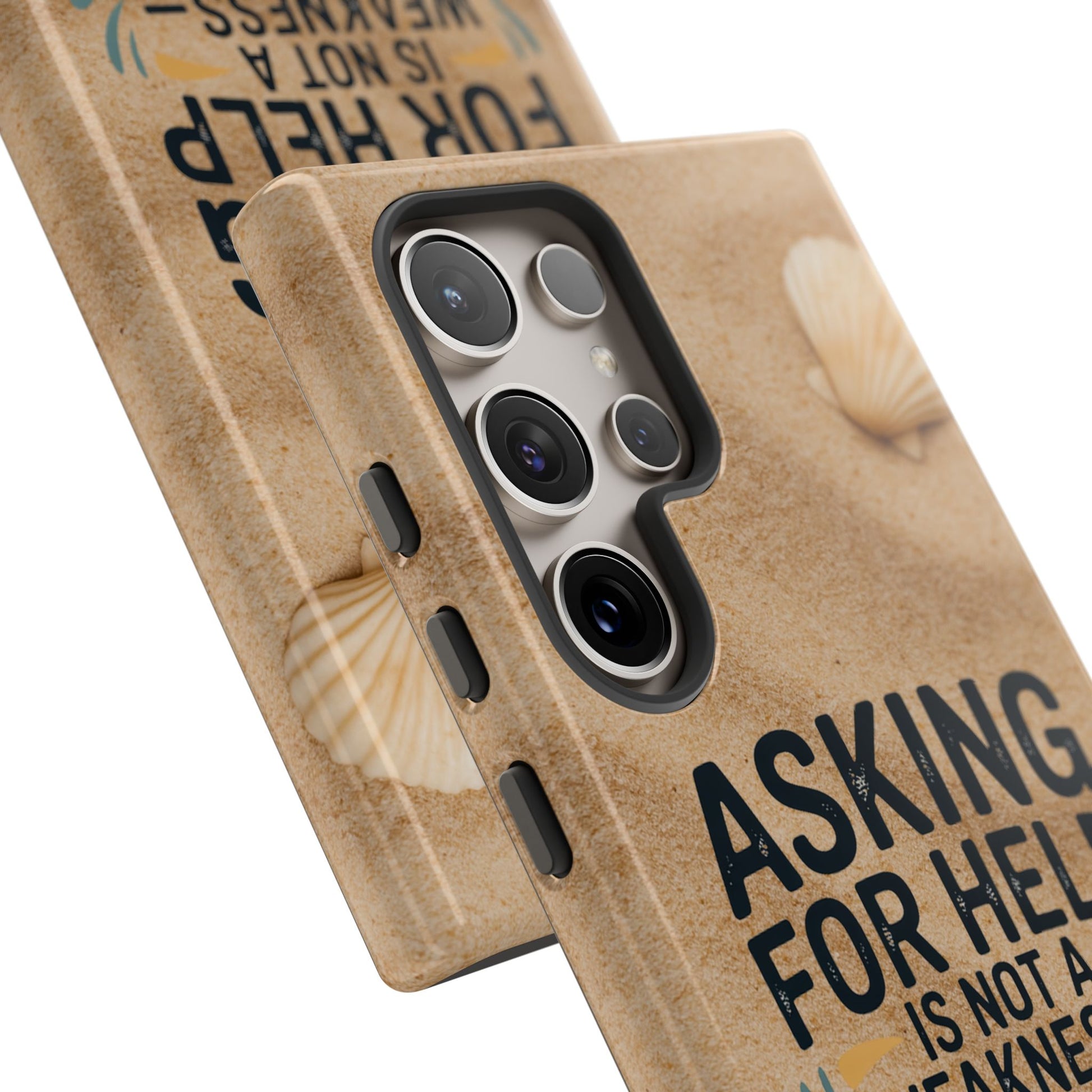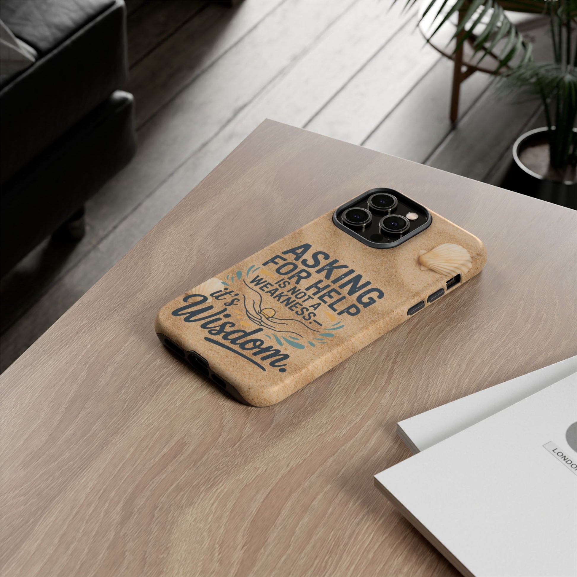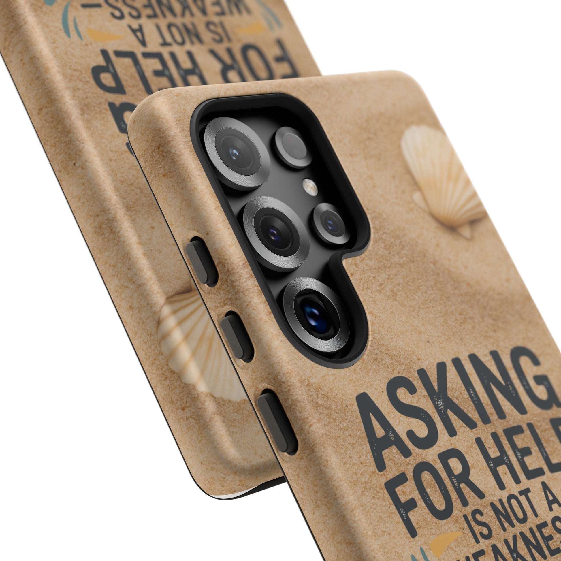 A slim, dual-layer phone case that carries a gentle reminder: asking for help is strength, not weakness. The soft sandy backdrop and small seashell accents give it a calm, coastal feel while the bold, handwritten typography reads like a supportive note. Built with a glossy or matte finish over a 3D-wrapped print, the case keeps your phone safe from drops and daily wear with a shock-absorbing TPU silicone liner and a rigid polycarbonate shell. Weather-resistant inks and certified materials mean the design holds up outdoors and everyday use. Lightweight and wireless-charging compatible, it’s designed to slip comfortably into life — on crowded commutes, quiet beach walks, or between work calls — offering both protection and a quiet, encouraging message.