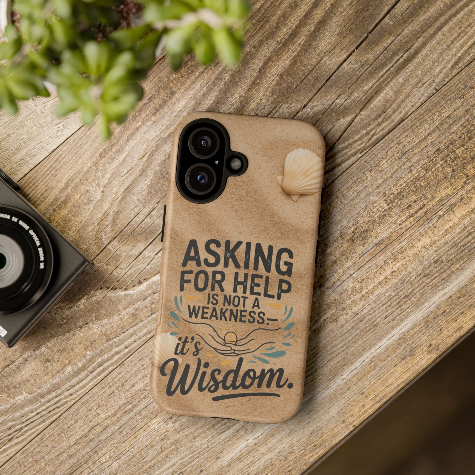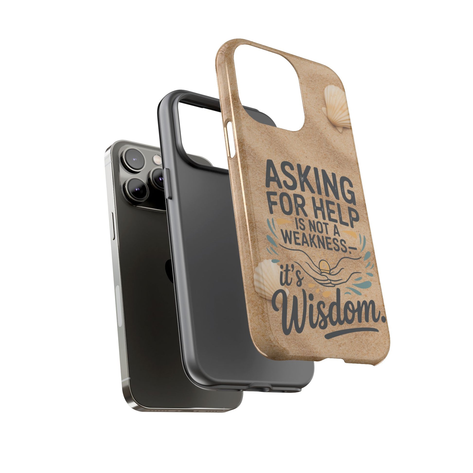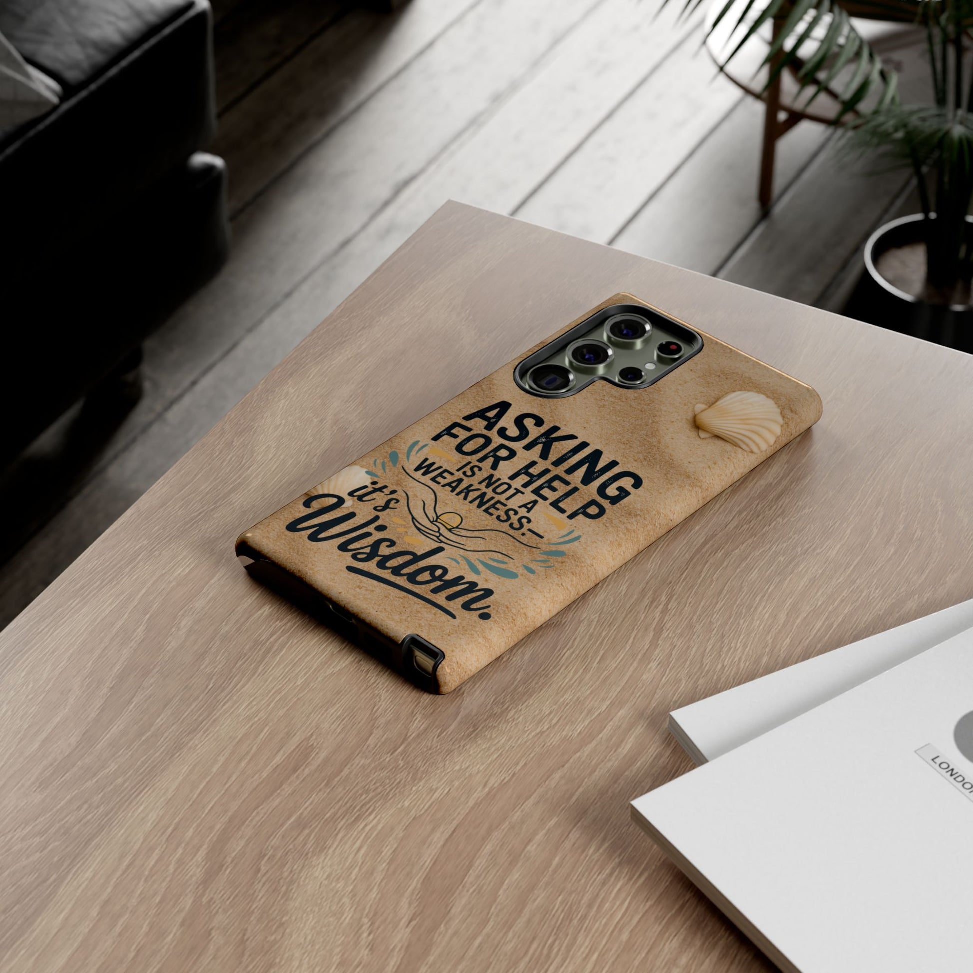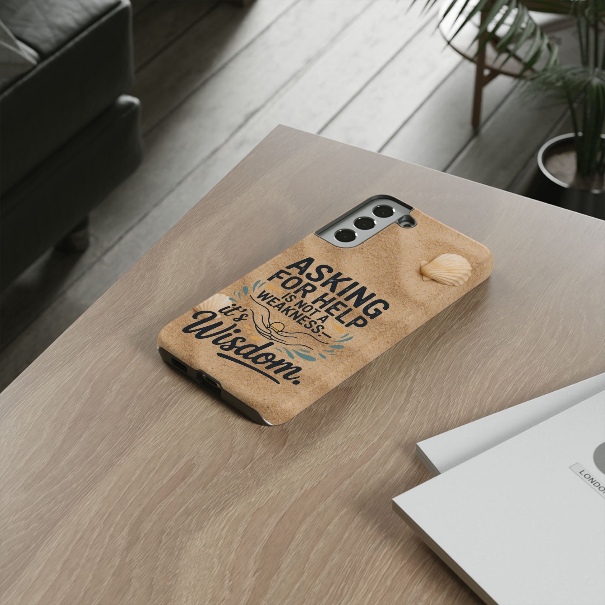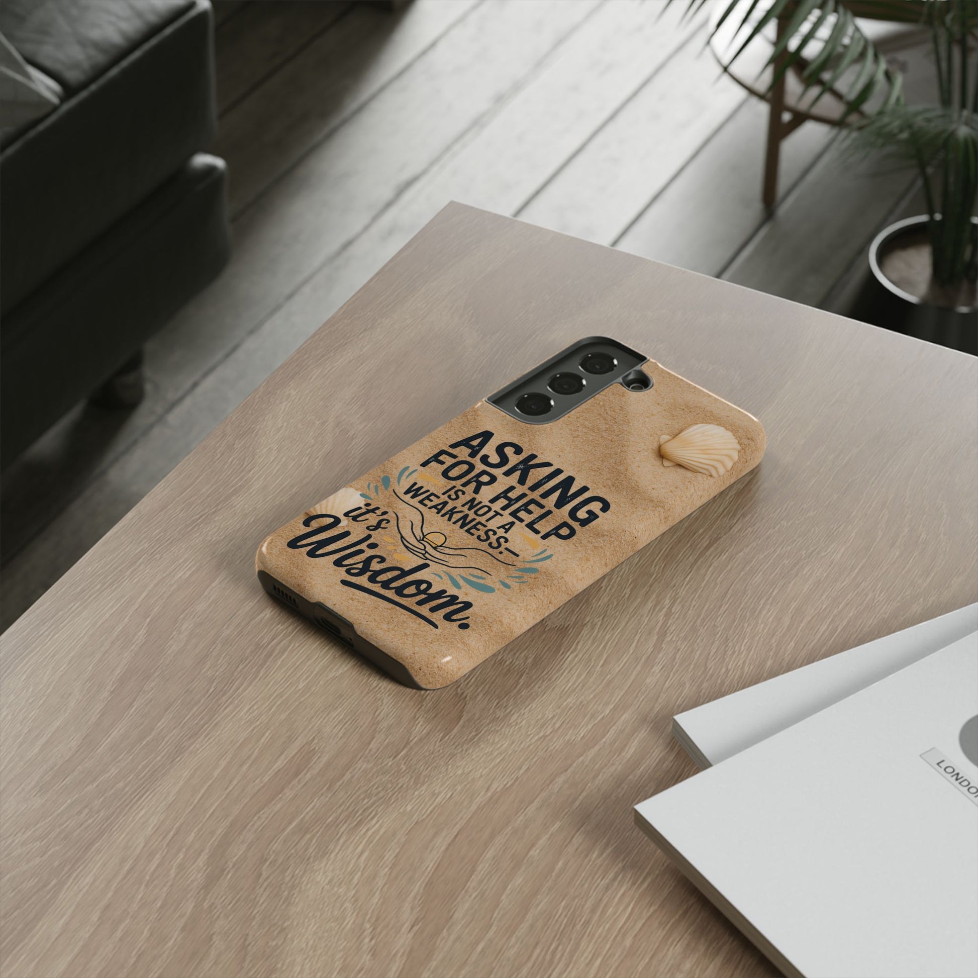 A slim, dual-layer phone case that carries a gentle reminder: asking for help is strength, not weakness. The soft sandy backdrop and small seashell accents give it a calm, coastal feel while the bold, handwritten typography reads like a supportive note. Built with a glossy or matte finish over a 3D-wrapped print, the case keeps your phone safe from drops and daily wear with a shock-absorbing TPU silicone liner and a rigid polycarbonate shell. Weather-resistant inks and certified materials mean the design holds up outdoors and everyday use. Lightweight and wireless-charging compatible, it’s designed to slip comfortably into life — on crowded commutes, quiet beach walks, or between work calls — offering both protection and a quiet, encouraging message.