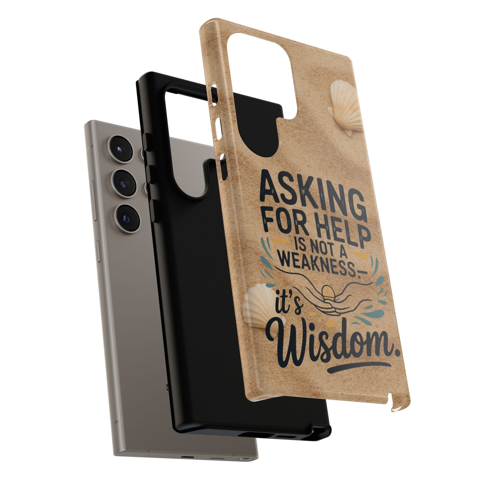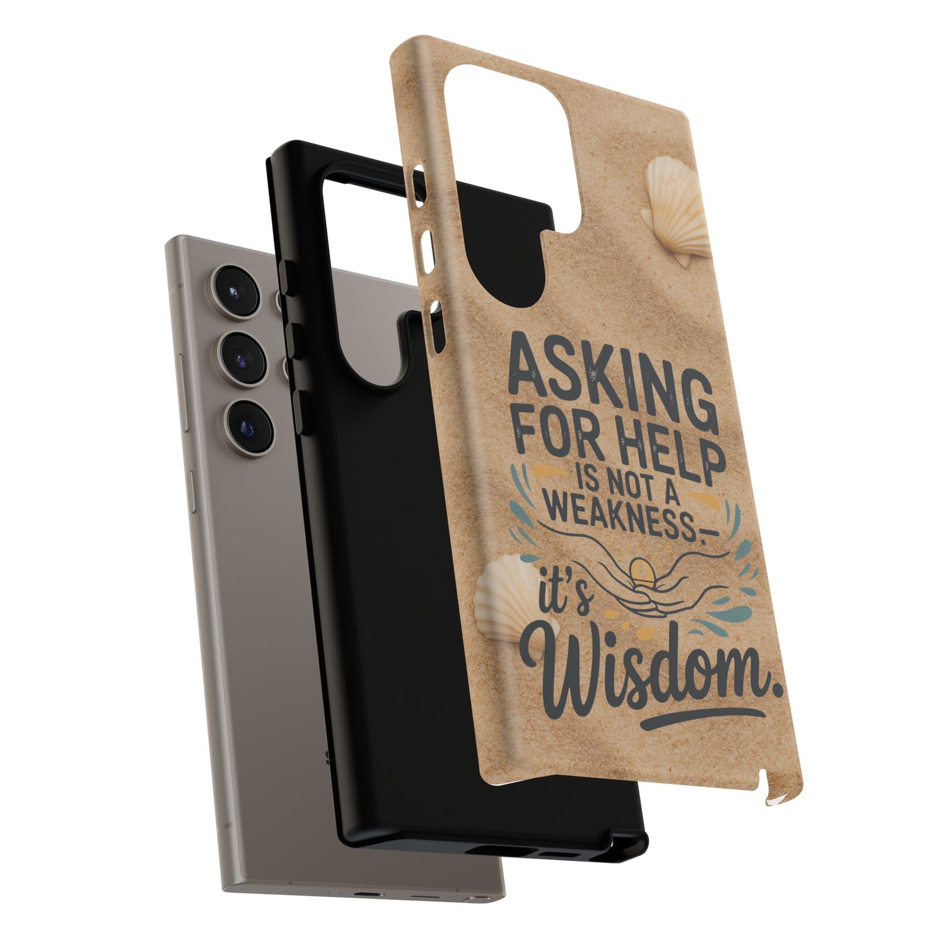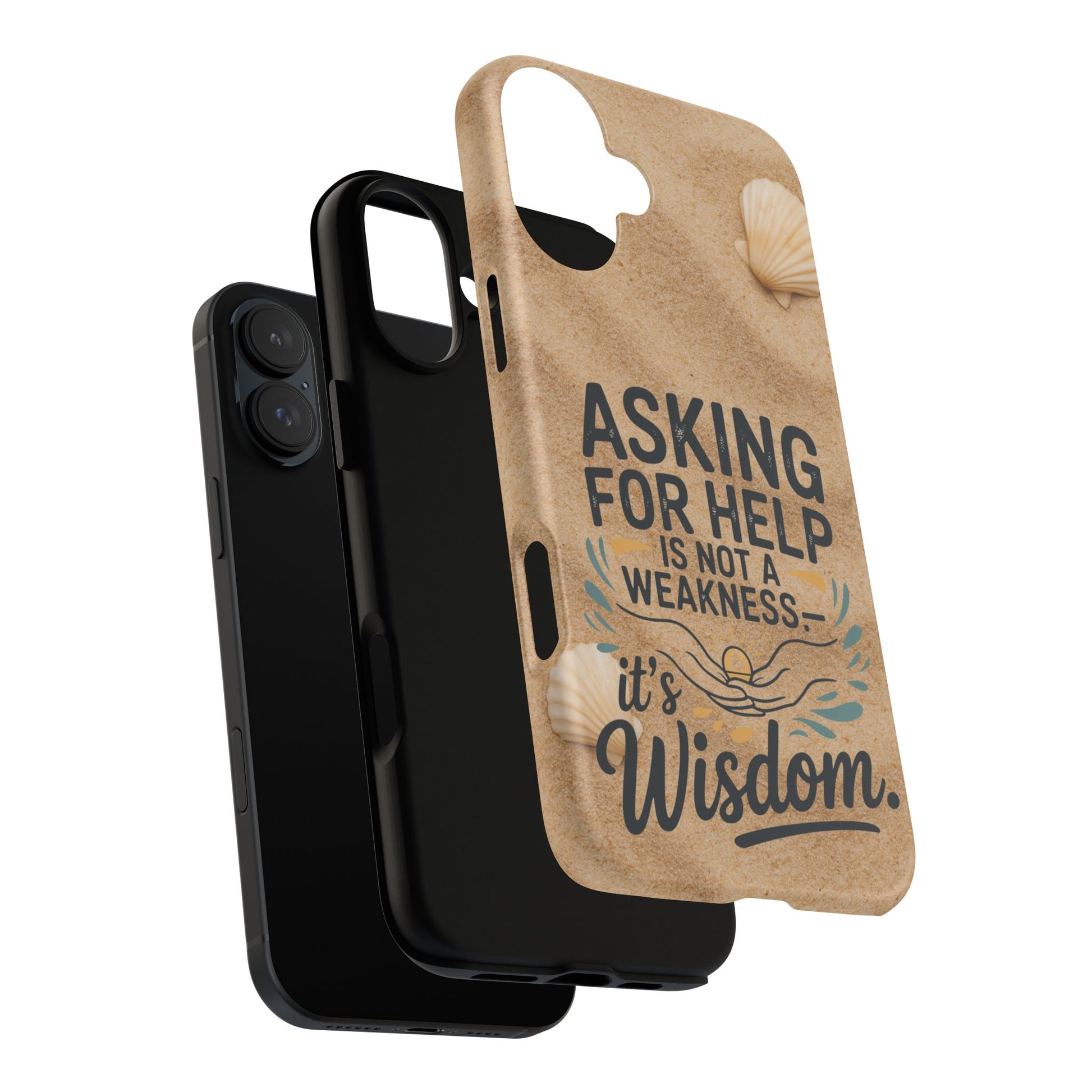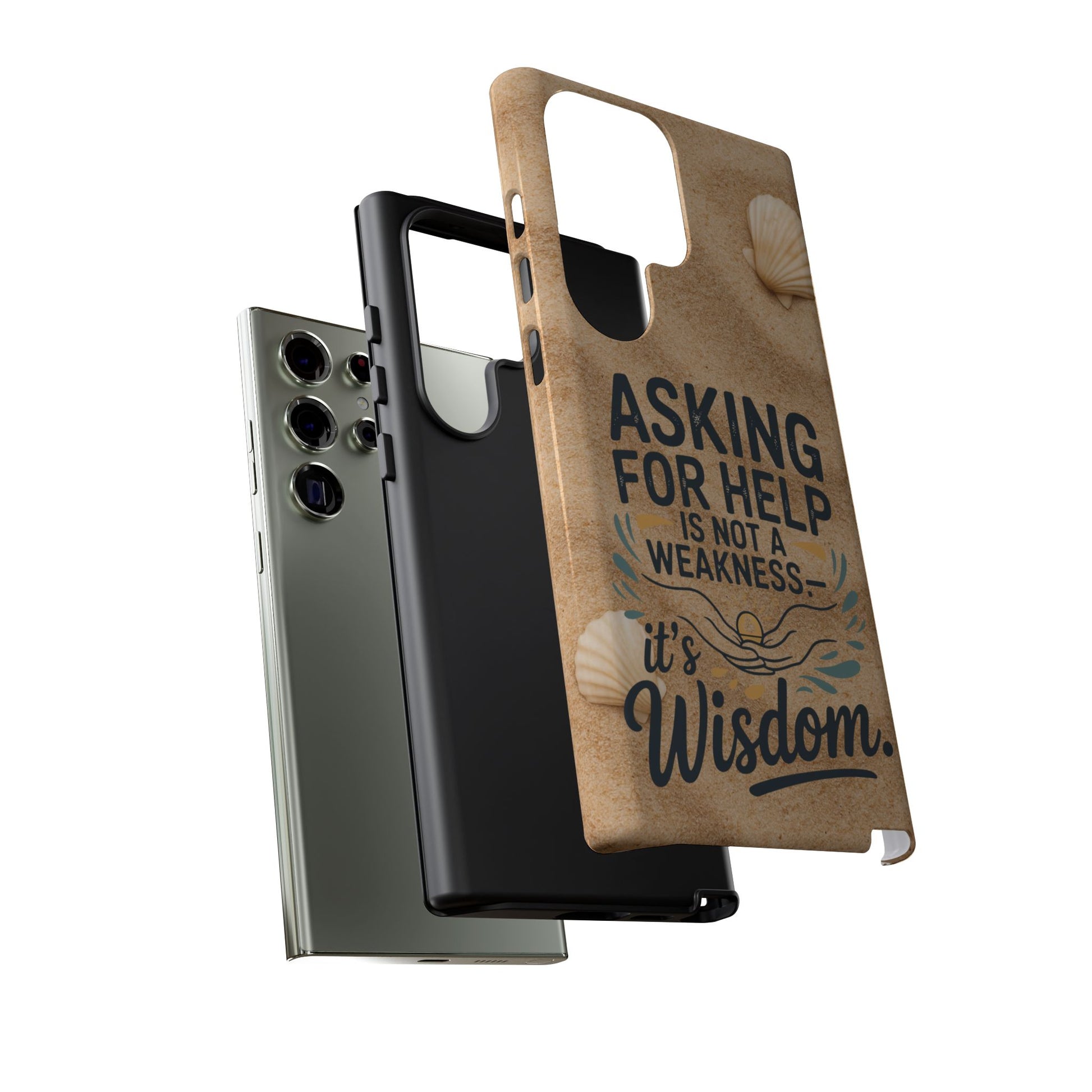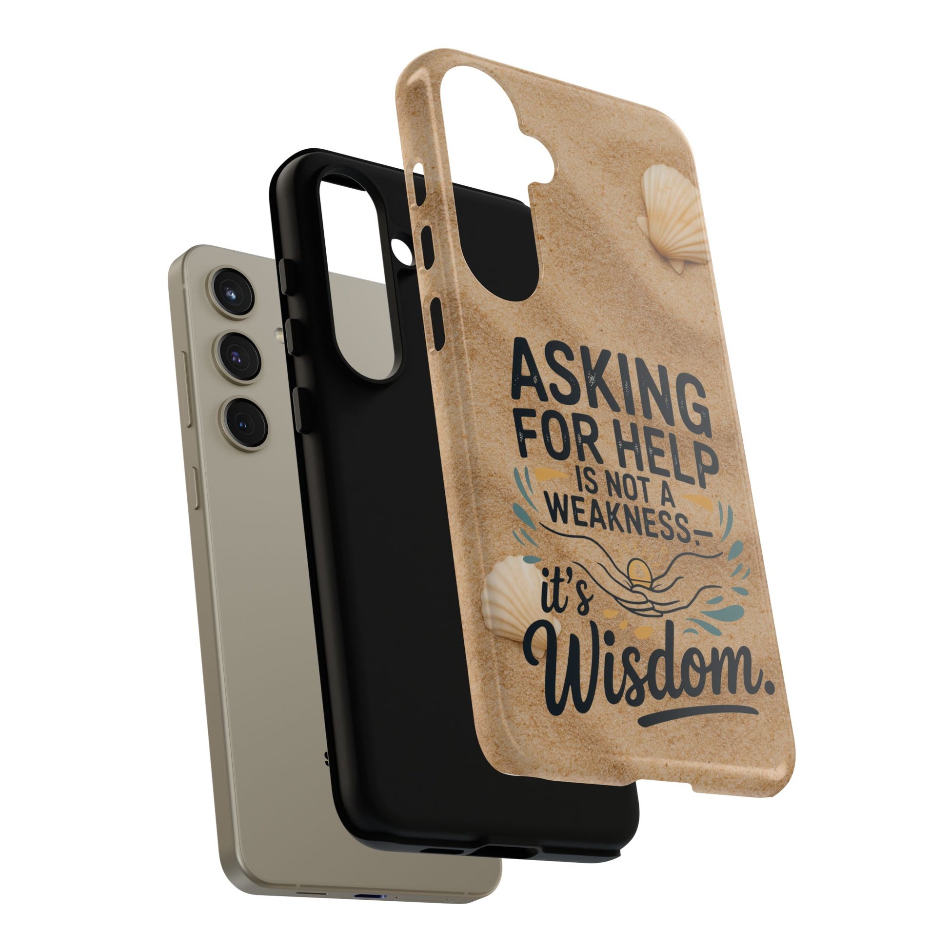 A slim, dual-layer phone case that carries a gentle reminder: asking for help is strength, not weakness. The soft sandy backdrop and small seashell accents give it a calm, coastal feel while the bold, handwritten typography reads like a supportive note. Built with a glossy or matte finish over a 3D-wrapped print, the case keeps your phone safe from drops and daily wear with a shock-absorbing TPU silicone liner and a rigid polycarbonate shell. Weather-resistant inks and certified materials mean the design holds up outdoors and everyday use. Lightweight and wireless-charging compatible, it’s designed to slip comfortably into life — on crowded commutes, quiet beach walks, or between work calls — offering both protection and a quiet, encouraging message.